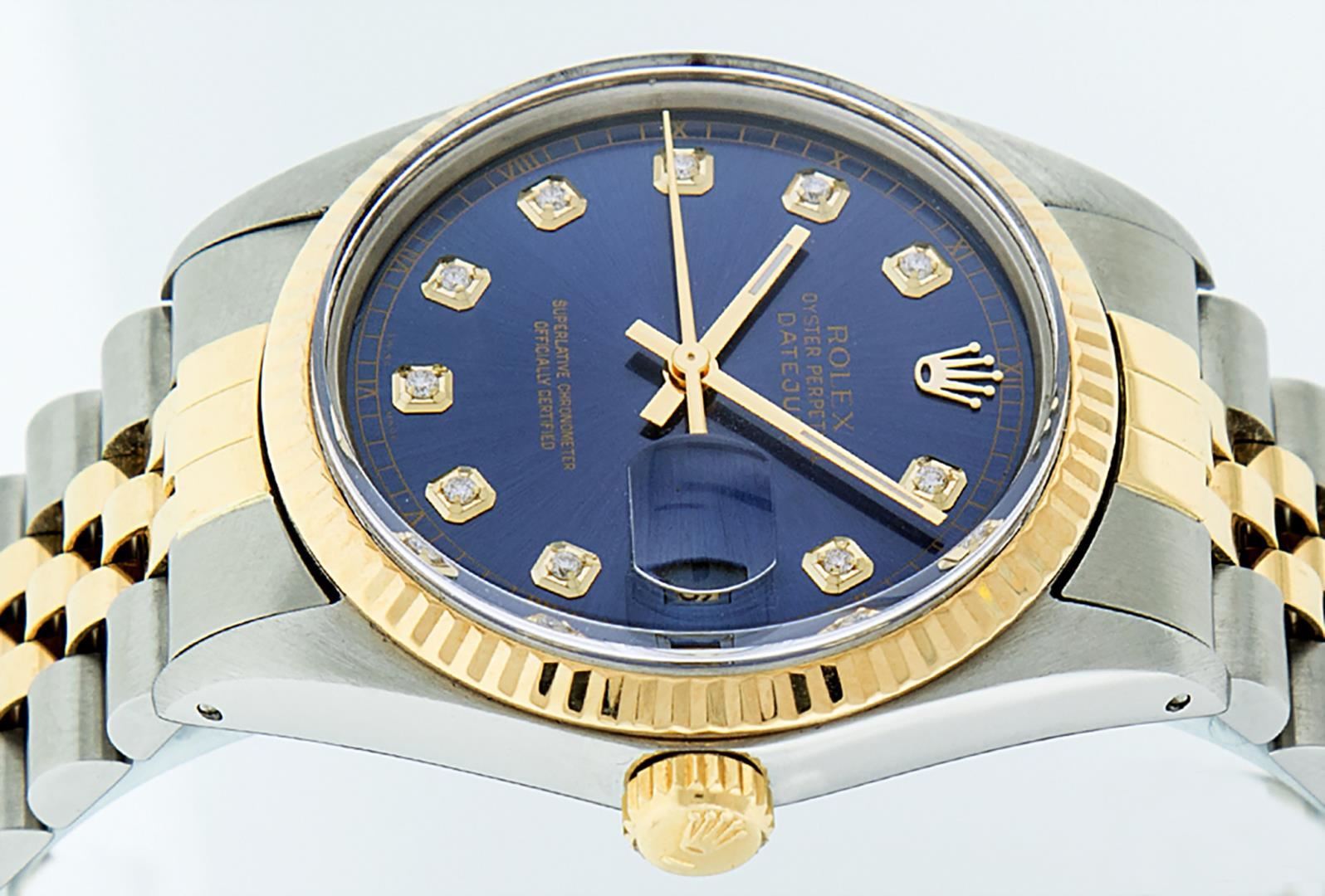 One Mens Pre Owned Two Tone Yellow Gold And Stainless Steel Rolex Datejust Polished, Serviced And Electronically Tested, Rolex Yellow Gold And Stainless Steel Case: 36mm, Rolex Yellow Gold Crown, Rolex Bezel: Yellow Gold Fluted Bezel. Custom Crystal: New Acrylic With Magnified Date Window. Custom Hands: New Luminecent Hands. Rolex Movement: Automatic Winding Movement 3035. Custom Dial: Custom Blue Dial With Added Genuine Diamond Hour Markers And Square Roman Track, Diamond Count: 10 Diamonds On Dial. Date Window: 3 O'Clock Position Date Display, Quickset, Model: Datejust, Condition: G-6 Extra Fine. Rolex Bracelet: Two Tone Yellow Gold And Stainless Steel Jubilee Band. Bright Polish. 7.0 Inch Length, Adjustable. Standard Clasp, With Rolex Logo. This Watch Has Been Serviced And Polished It Is Free Of All Scratches And Dents.