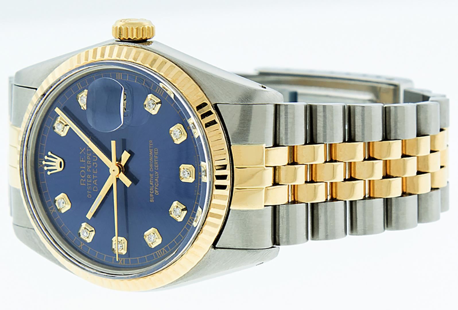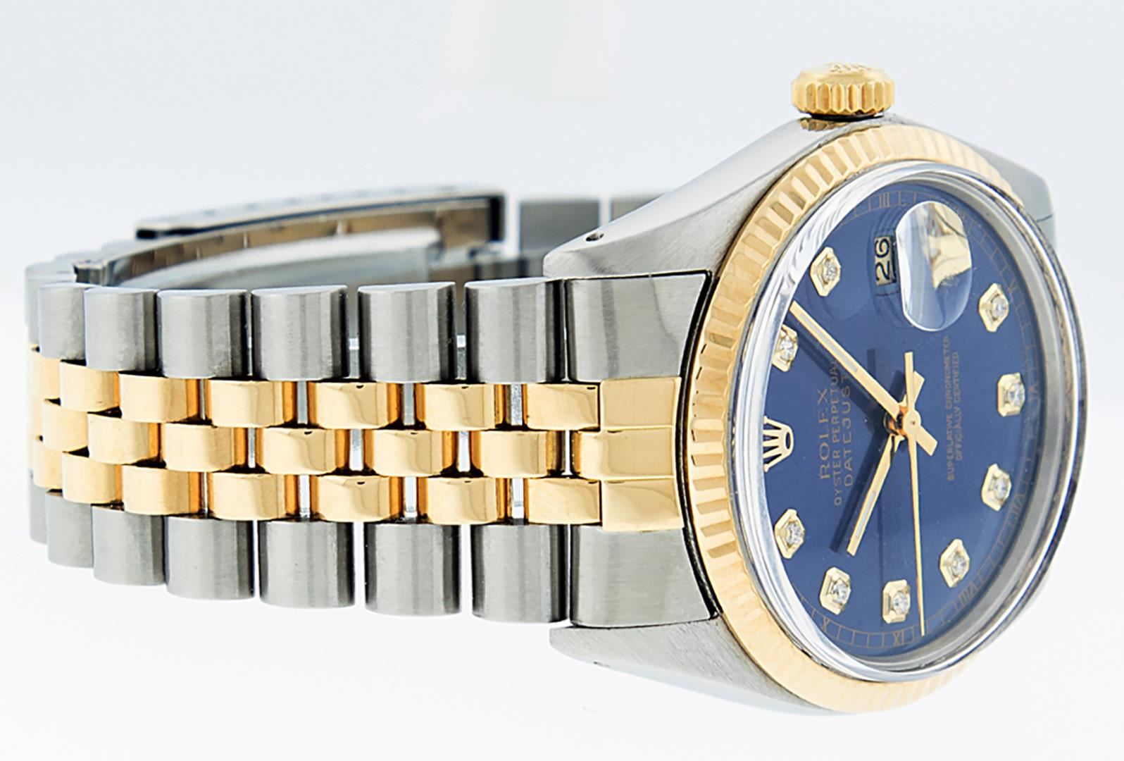 One Mens Pre Owned Two Tone Yellow Gold And Stainless Steel Rolex Datejust Polished, Serviced And Electronically Tested, Rolex Yellow Gold And Stainless Steel Case: 36mm, Rolex Yellow Gold Crown, Rolex Bezel: Yellow Gold Fluted Bezel. Custom Crystal: New Acrylic With Magnified Date Window. Custom Hands: New Luminecent Hands. Rolex Movement: Automatic Winding Movement 3035. Custom Dial: Custom Blue Dial With Added Genuine Diamond Hour Markers And Square Roman Track, Diamond Count: 10 Diamonds On Dial. Date Window: 3 O'Clock Position Date Display, Quickset, Model: Datejust, Condition: G-6 Extra Fine. Rolex Bracelet: Two Tone Yellow Gold And Stainless Steel Jubilee Band. Bright Polish. 7.0 Inch Length, Adjustable. Standard Clasp, With Rolex Logo. This Watch Has Been Serviced And Polished It Is Free Of All Scratches And Dents.