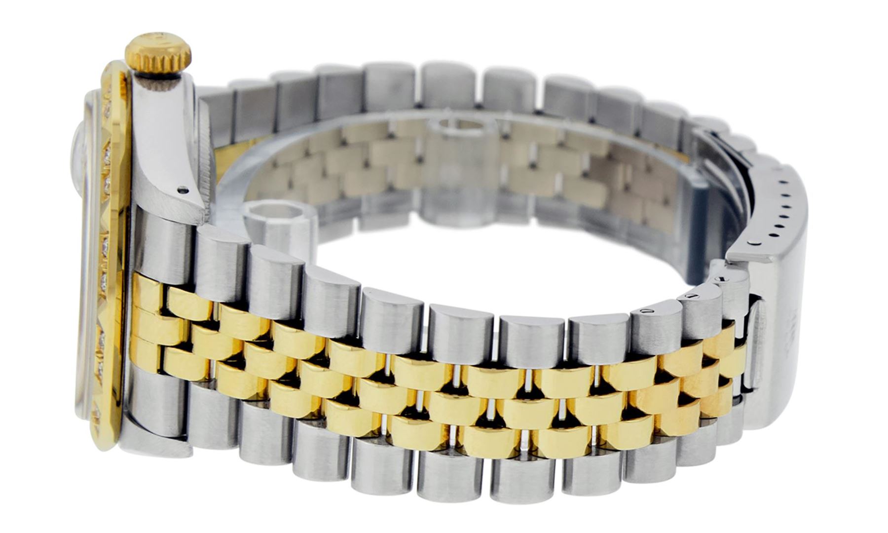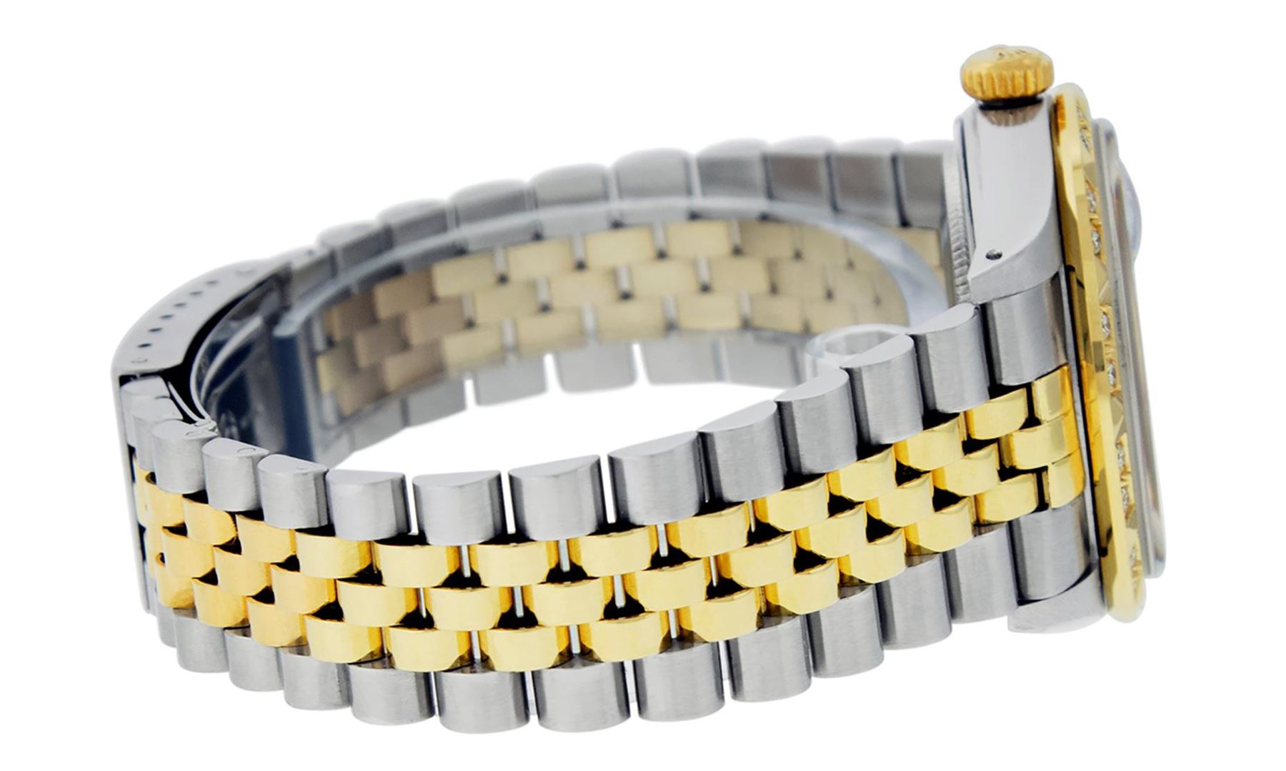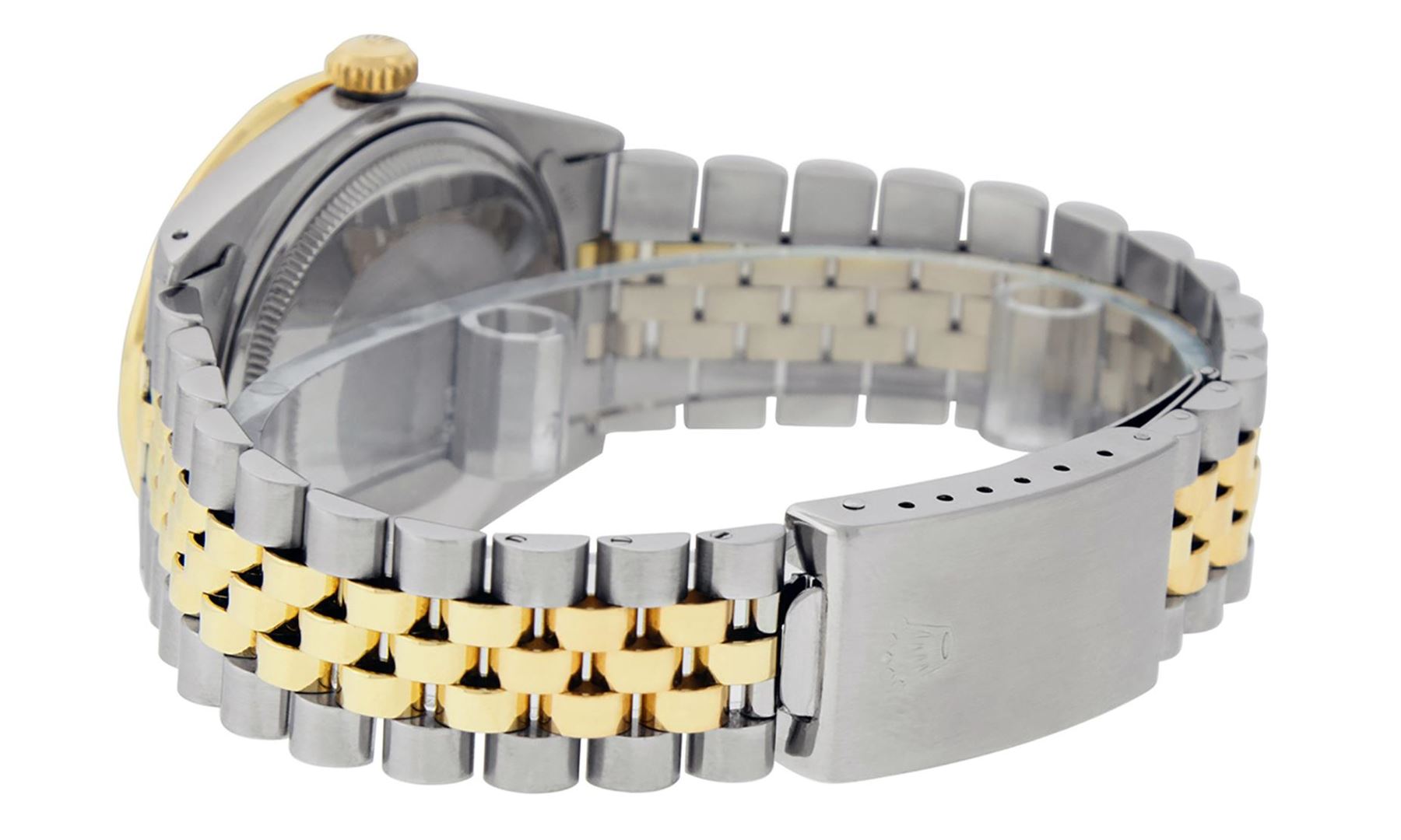 One Mens Pre Owned Two Tone Yellow Gold And Stainless Steel Rolex Datejust Polished Bright with Satin Finish, Serviced And Electronically Tested, Stainless Steel Case: 36mm, Yellow Gold Crown, Custom Bezel: New 18K Yellow Gold Pyramid Diamond Bezel, Diamond Count: 24 Diamonds In Bezel. Custom Crystal: New Sapphire With Date Window. Custom Hands: New Luminescent Hands. Rolex Movement: Automatic Winding Movement 3035. Custom Dial: Custom Blue Vignette Dial With Added Diamonds, Diamond Count: 10 Diamonds On Dial. Date Window: 3 O'Clock Position Date Display, Quickset, Model: Datejust. Condition: G-6 Extra Fine. Rolex Bracelet: Yellow Gold And Stainless Steel Jubilee Band. Bright Polish And Satin Finish. 7.0 Inch Length, Adjustable. Standard Clasp, With Rolex Logo. This Watch Has Been Serviced And Polished It Is Free Of All Scratches And Dents.