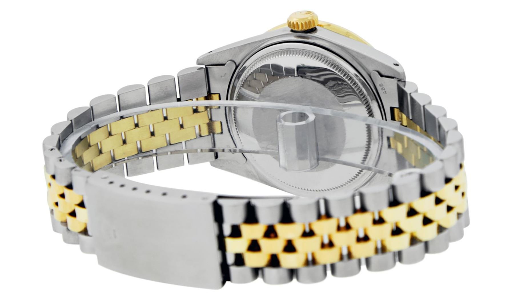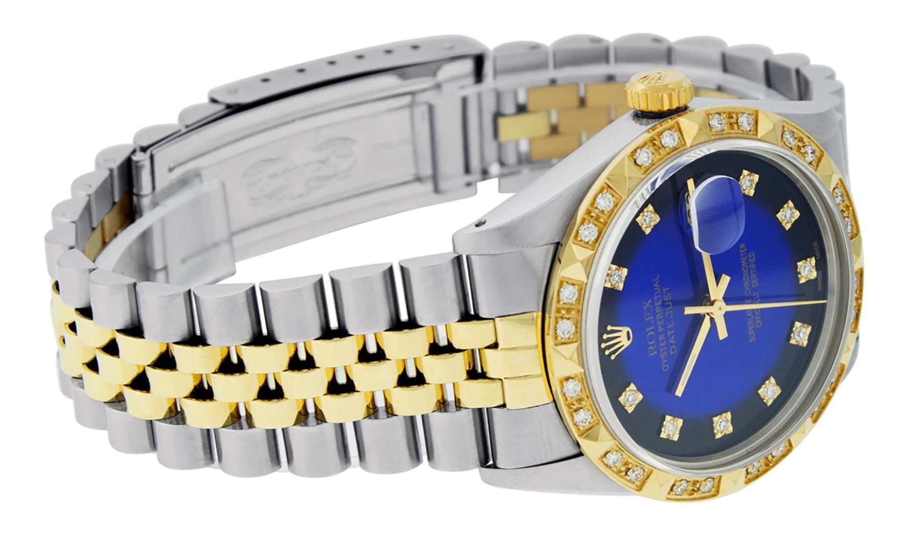 One Mens Pre Owned Two Tone Yellow Gold And Stainless Steel Rolex Datejust Polished Bright with Satin Finish, Serviced And Electronically Tested, Stainless Steel Case: 36mm, Yellow Gold Crown, Custom Bezel: New 18K Yellow Gold Pyramid Diamond Bezel, Diamond Count: 24 Diamonds In Bezel. Custom Crystal: New Sapphire With Date Window. Custom Hands: New Luminescent Hands. Rolex Movement: Automatic Winding Movement 3035. Custom Dial: Custom Blue Vignette Dial With Added Diamonds, Diamond Count: 10 Diamonds On Dial. Date Window: 3 O'Clock Position Date Display, Quickset, Model: Datejust. Condition: G-6 Extra Fine. Rolex Bracelet: Yellow Gold And Stainless Steel Jubilee Band. Bright Polish And Satin Finish. 7.0 Inch Length, Adjustable. Standard Clasp, With Rolex Logo. This Watch Has Been Serviced And Polished It Is Free Of All Scratches And Dents.