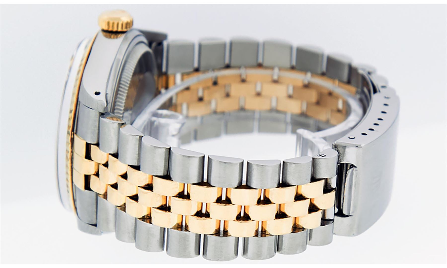 One Mens Pre Owned Two Tone Yellow Gold And Stainless Steel Rolex Datejust Polished, Serviced And Electronically Tested, Rolex Yellow Gold And Stainless Steel Case: 36mm, Rolex Yellow Gold Crown, Rolex Bezel: Yellow Gold Fluted Bezel. Custom Crystal: New Acrylic With Magnified Date Window. Custom Hands: New Luminecent Hands. Rolex Movement: Automatic Winding Movement 3035. Custom Dial: Custom Blue Vignette With Added Diamond Hour Markers, Diamond Count: 58 Diamonds On Dial. Date Window: 3 O'Clock Position Date Display, Quickset, Model: Datejust, Condition: G-6 Extra Fine. Rolex Bracelet: Two Tone Yellow Gold And Stainless Steel Jubilee Band. Bright Polish. 7.0 Inch Length, Adjustable. Standard Clasp, With Rolex Logo. This Watch Has Been Serviced And Polished It Is Free Of All Scratches And Dents.