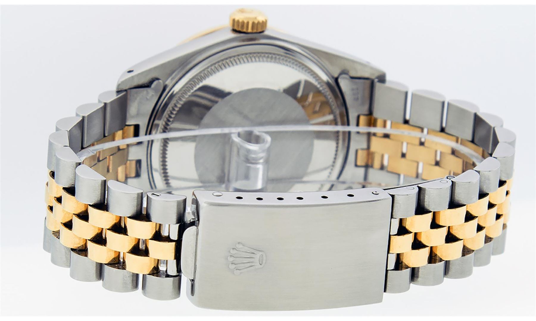 One Mens Pre Owned Rolex Two Tone Yellow Gold And Stainless Steel Datejust Polished, Serviced & Electronically Tested, Rolex Yellow Gold & Stainless Steel Case: 36mm, Rolex Yellow Gold Crown, Custom Bezel: New 18K Yellow Gold Ruby Beadset Diamond Bezel, Diamond Count: 36 Diamonds + 4 Rubies. Custom Crystal: New Sapphire With Date Window. Custom Hands: New Luminescent Hands. Rolex Movement: Automatic Winding Movement 3035. Custom Dial: Custom Brown Dial With Added Diamonds. Diamond Count: 10 Diamonds On Dial. Date Window: 3 O'Clock Position Date Display, Quickset, Model: Datejust. Condition: G-6 Extra Fine. Rolex Bracelet: Two Tone Yellow Gold And Stainless Steel Jubilee Band. Bright Polish. 7.0 Inch Length, Adjustable. Standard Clasp, With Rolex Logo. This Watch Has Been Serviced Time Tested And Is In Excellent Condition It Is Free Of All Scratches And Dents.