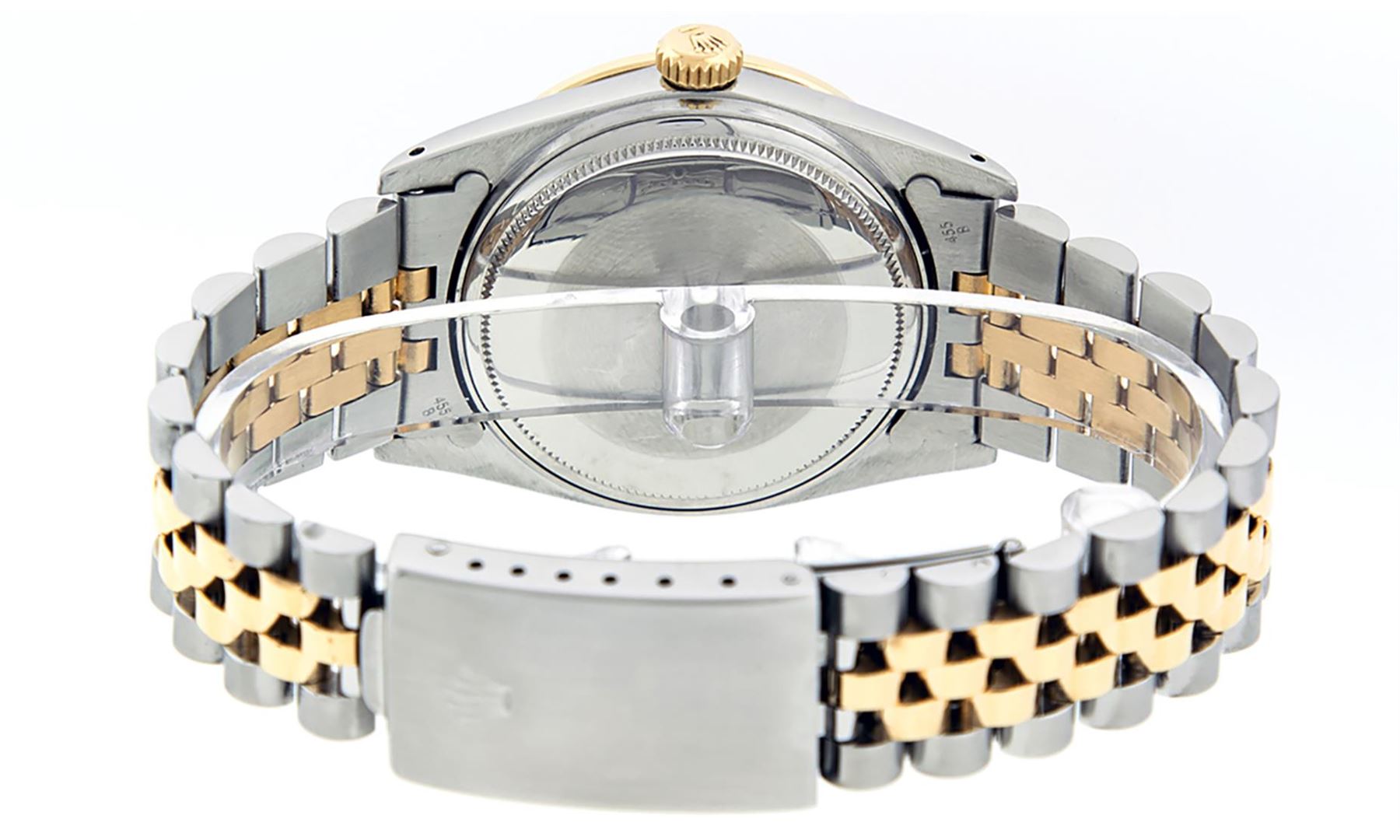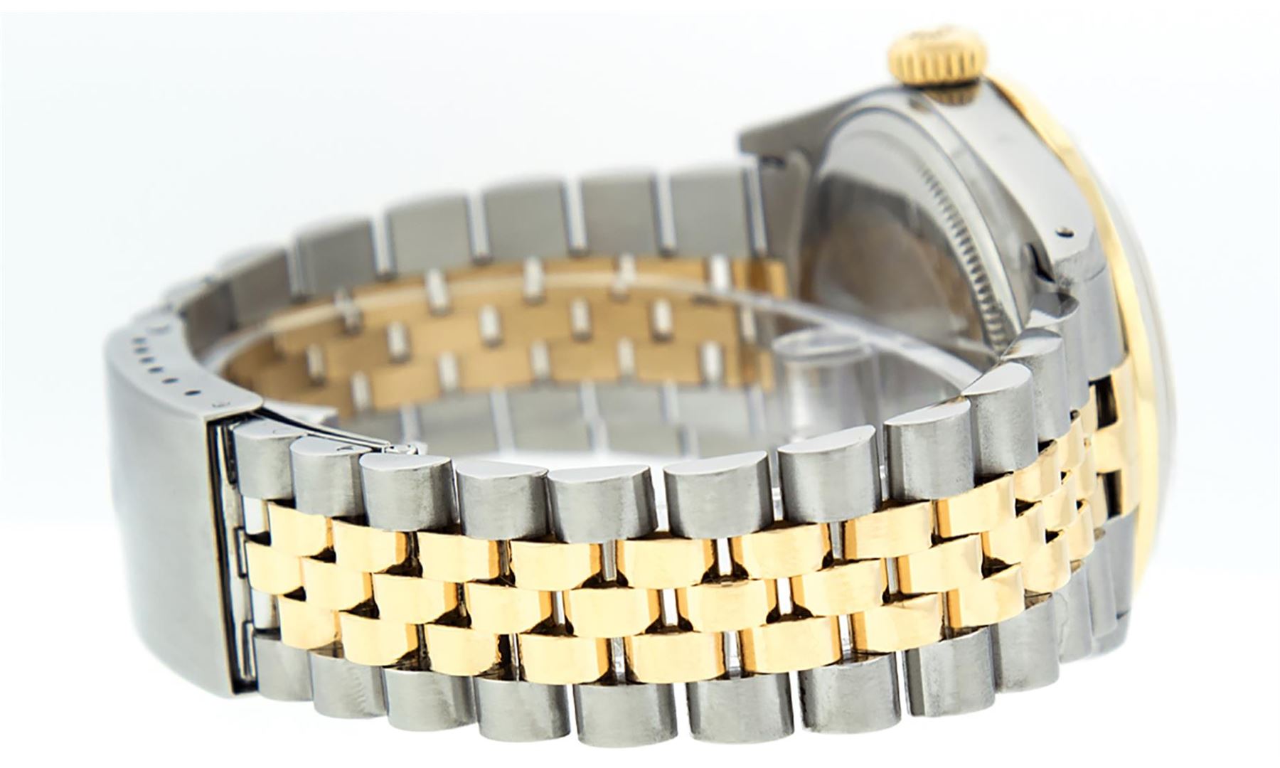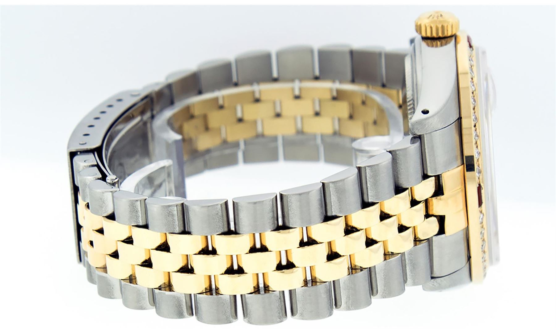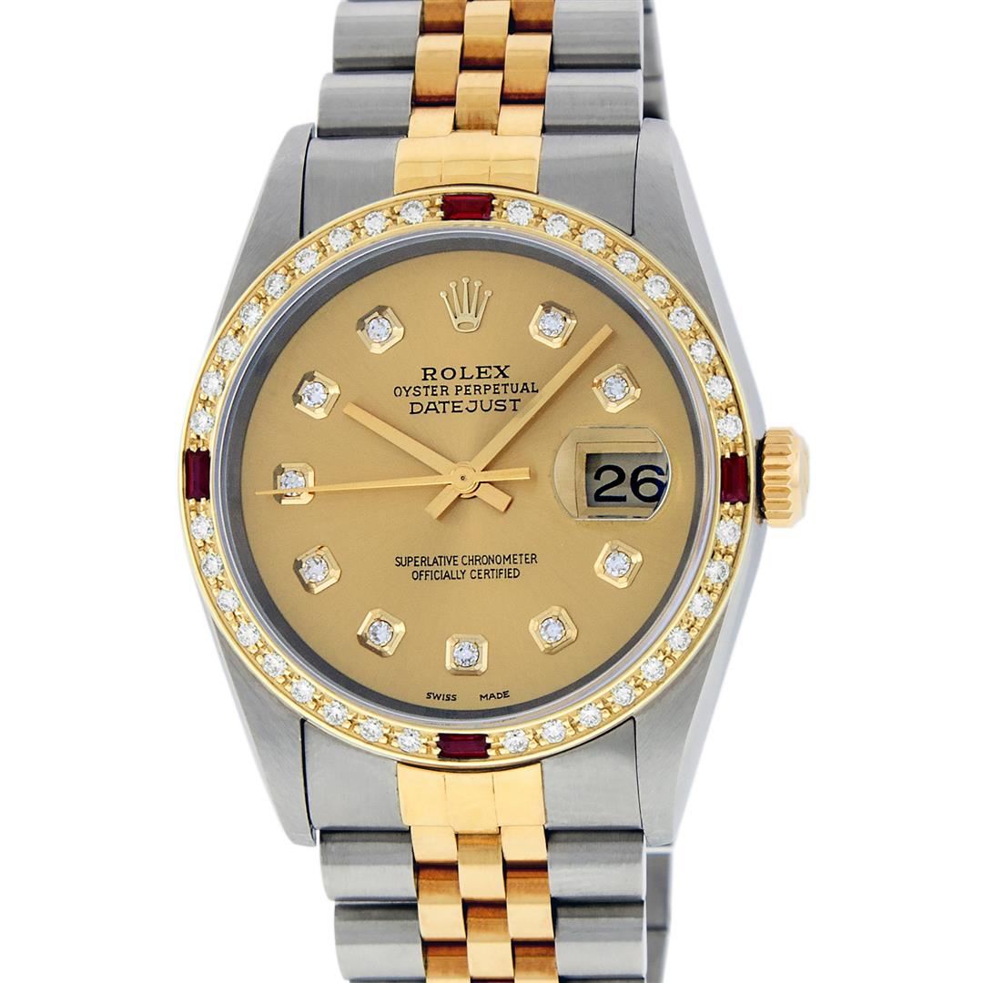 One Mens Pre Owned Rolex Two Tone Yellow Gold And Stainless Steel Datejust Polished, Serviced & Electronically Tested, Yellow Gold And Stainless Steel Case: 36mm, Yellow Gold Crown, Custom Bezel: New 18K Yellow Gold Ruby Beadset Diamond Bezel, Diamond Count: 36 Diamonds + 4 Rubies. Custom Crystal: New Sapphire With Date Window. Custom Hands: New Luminescent Hands. Rolex Movement: Automatic Winding Movement 3035. Custom Dial: Custom Champagne Dial With Added Diamond Hour Markers. Diamond Count: 10 Diamonds On Dial. Date Window: 3 O'Clock Position Date Display, Quickset, Model: Datejust. Condition: G-6 Extra Fine. Rolex Bracelet: Two Tone Yellow Gold And Stainless Steel Jubilee Band. Bright Polish. 7.0 Inch Length, Adjustable. Standard Clasp, With Rolex Logo. This Watch Has Been Serviced Time Tested And Is In Excellent Condition It Is Free Of All Scratches And Dents.