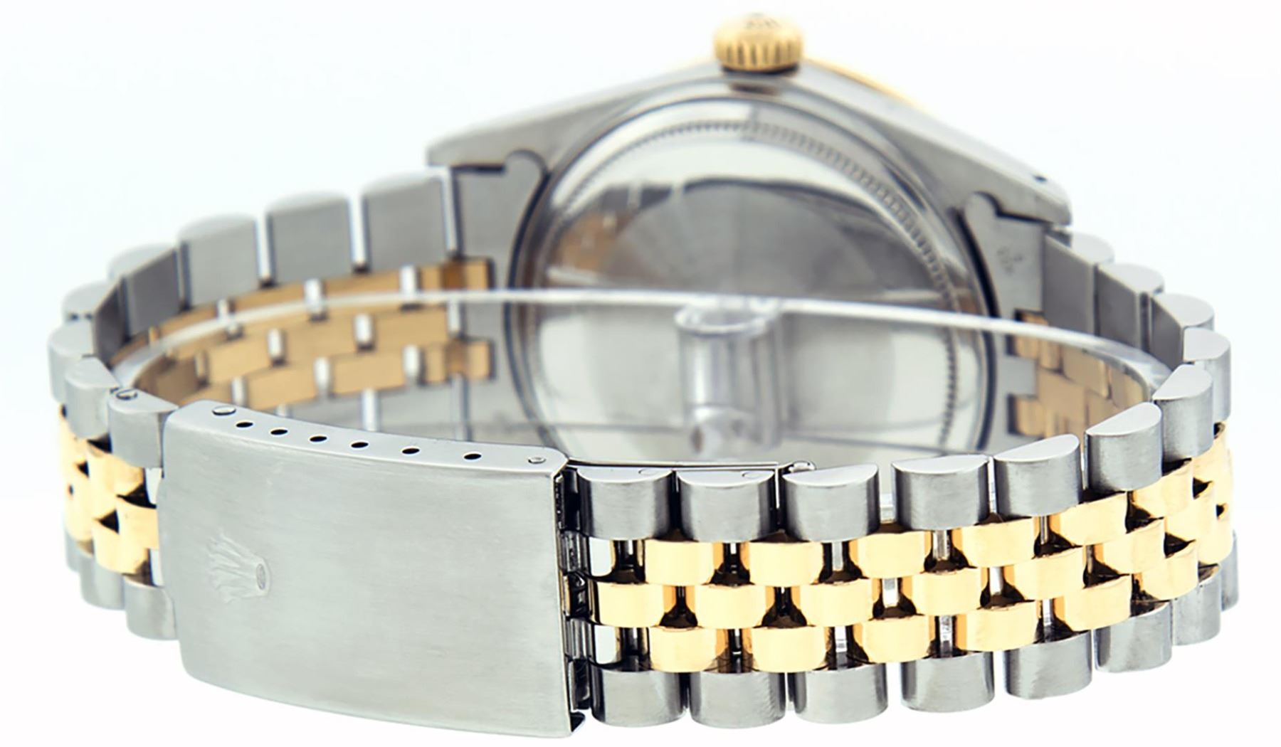 One Mens Pre Owned Rolex Two Tone Yellow Gold And Stainless Steel Datejust Polished, Serviced & Electronically Tested, Yellow Gold And Stainless Steel Case: 36mm, Yellow Gold Crown, Custom Bezel: New 18K Yellow Gold Ruby Beadset Diamond Bezel, Diamond Count: 36 Diamonds + 4 Rubies. Custom Crystal: New Sapphire With Date Window. Custom Hands: New Luminescent Hands. Rolex Movement: Automatic Winding Movement 3035. Custom Dial: Custom Champagne Dial With Added Diamond Hour Markers. Diamond Count: 10 Diamonds On Dial. Date Window: 3 O'Clock Position Date Display, Quickset, Model: Datejust. Condition: G-6 Extra Fine. Rolex Bracelet: Two Tone Yellow Gold And Stainless Steel Jubilee Band. Bright Polish. 7.0 Inch Length, Adjustable. Standard Clasp, With Rolex Logo. This Watch Has Been Serviced Time Tested And Is In Excellent Condition It Is Free Of All Scratches And Dents.