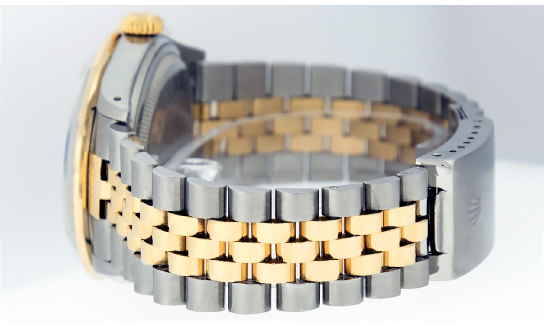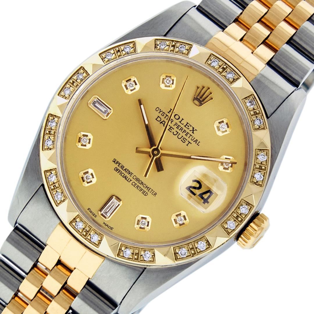 One Mens Pre Owned Two Tone Yellow Gold And Stainless Steel Rolex Datejust Polished Bright with Satin Finish, Serviced And Electronically Tested, Rolex Stainless Steel Case: 36mm, Yellow Gold Crown, Custom Bezel: New 18K Yellow Gold Pyramid Diamond Bezel, Diamond Count: 24 Diamonds. Custom Crystal: New Sapphire With Magnified Date. Custom Hands: New Luminescent Hands. Rolex Movement: Automatic Winding Movement 3035. Custom Dial: Custom Champagne Dial With Added Diamonds, Diamond Count: 8 Diamonds + 2 Baguette Diamonds In Dial. Date Window: 3 O'Clock Position Date Display, Quickset, Model: Datejust. Condition: G-6 Extra Fine. Rolex Bracelet: Yellow Gold And Stainless Steel Jubilee Band. Bright Polish And Satin Finish. 7.0 Inch Length, Adjustable. Standard Clasp, With Rolex Logo. This Watch Has Been Serviced And Polished It Is Free Of All Scratches And Dents.