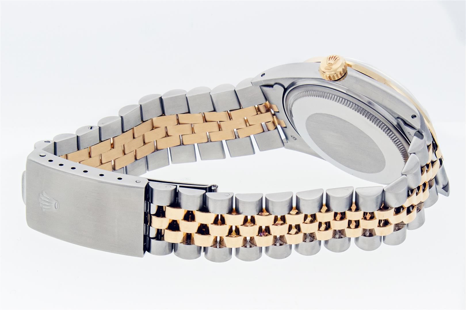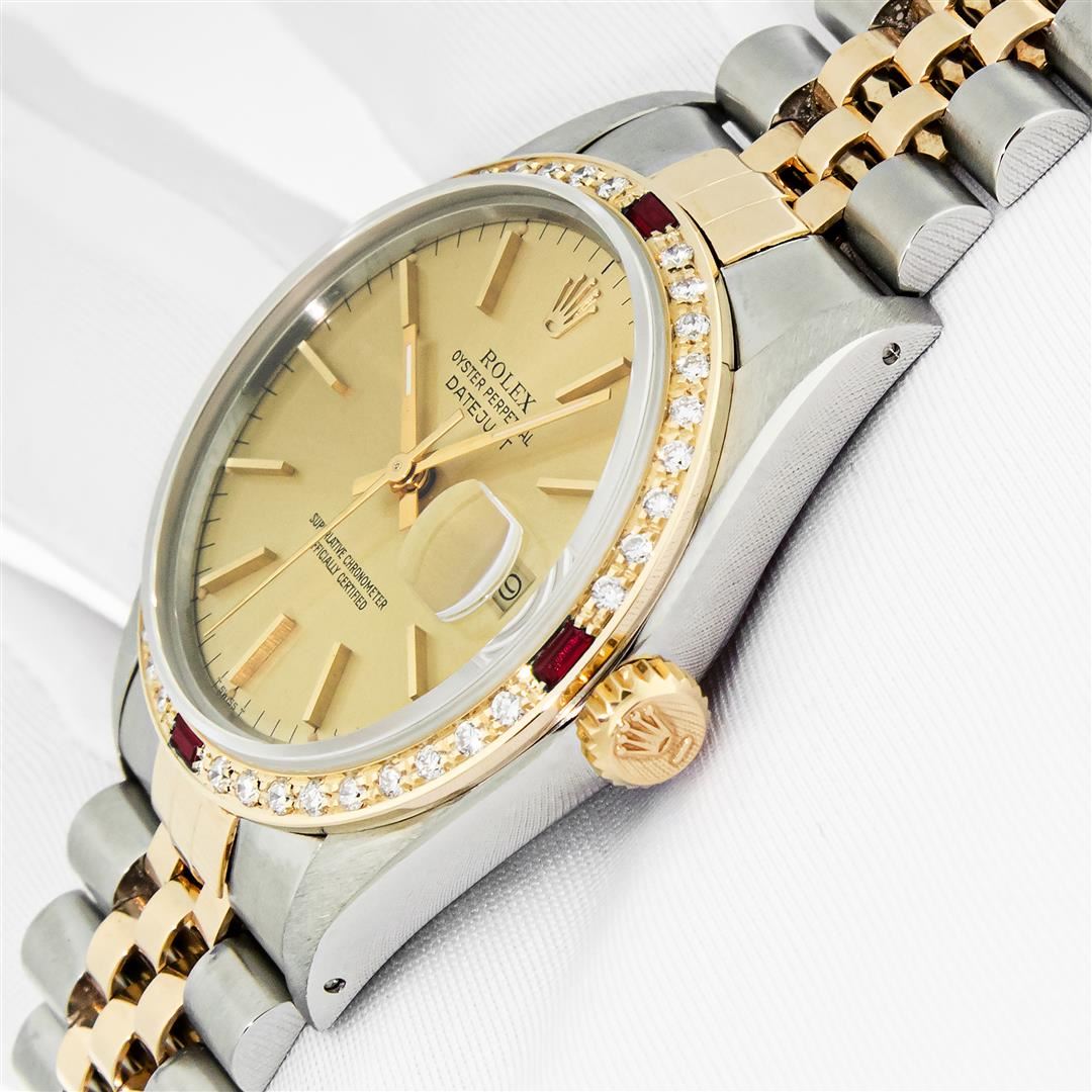 One Mens Pre Owned Two Tone Yellow Gold & Stainless Steel Rolex Datejust Polished, Serviced & Electronically Tested, Yellow Gold & Stainless Steel Case: 36mm, Rolex Yellow Gold Crown, Custom Bezel: New 18K Yellow Gold Ruby Beadset Diamond Bezel, Diamond Count: 36 Diamonds + 4 Rubies, Clarity: SI-VS, Color: G to H. Custom Crystal: New Sapphire With Magnified Date Window. Custom Hands: New Hands. Rolex Movement: Automatic Winding Movement. Rolex Factory Dial: Champagne With Index Hour Markers And Dash Track. Date Window: 3 O'Clock Position Date Display, Quickset, Model: Datejust. Condition: G-6 Extra Fine. Rolex Bracelet: Two Tone Yellow Gold & Stainless Steel Jubilee Band. Bright Polish. 7.0 Inch Length, Adjustable. Standard Clasp, With Rolex Logo. This Watch Has Been Serviced Time Tested And Is In Excellent Condition It Is Free Of All Scratches And Dents.