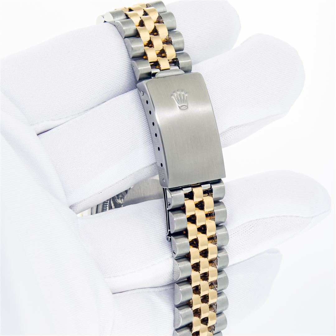 One Mens Pre Owned Two Tone Yellow Gold & Stainless Steel Rolex Datejust Polished, Serviced & Electronically Tested, Yellow Gold & Stainless Steel Case: 36mm, Rolex Yellow Gold Crown, Custom Bezel: New 18K Yellow Gold Sapphire Beadset Diamond Bezel, Diamond Count: 36 Diamonds + 4 Sapphires, Clarity: SI-VS, Color: G to H. Custom Crystal: New Sapphire With Magnified Date Window. Custom Hands: New Hands. Rolex Movement: Automatic Winding Movement. Rolex Factory Dial: Champagne With Index Hour Markers And Dash Track. Date Window: 3 O'Clock Position Date Display, Quickset, Model: Datejust. Condition: G-6 Extra Fine. Rolex Bracelet: Two Tone Yellow Gold & Stainless Steel Jubilee Band. Bright Polish. 7.0 Inch Length, Adjustable. Standard Clasp, With Rolex Logo. This Watch Has Been Serviced Time Tested And Is In Excellent Condition It Is Free Of All Scratches And Dents.
