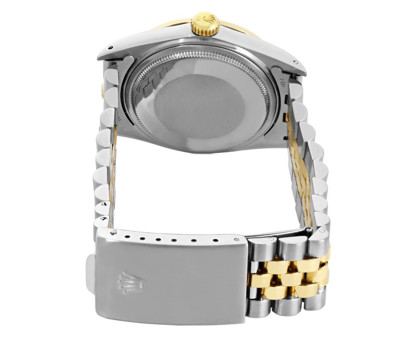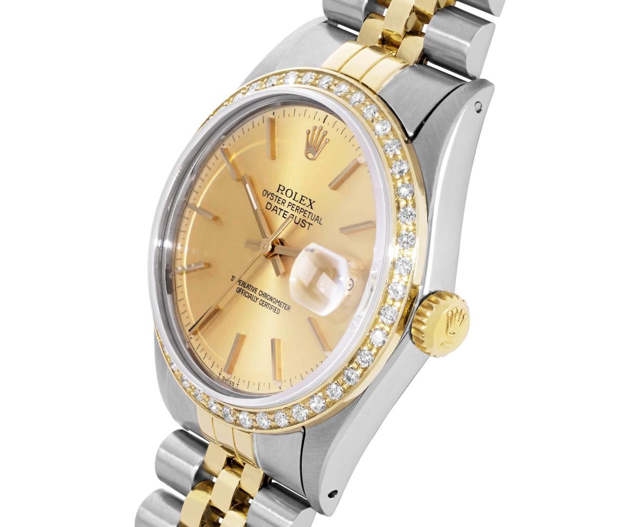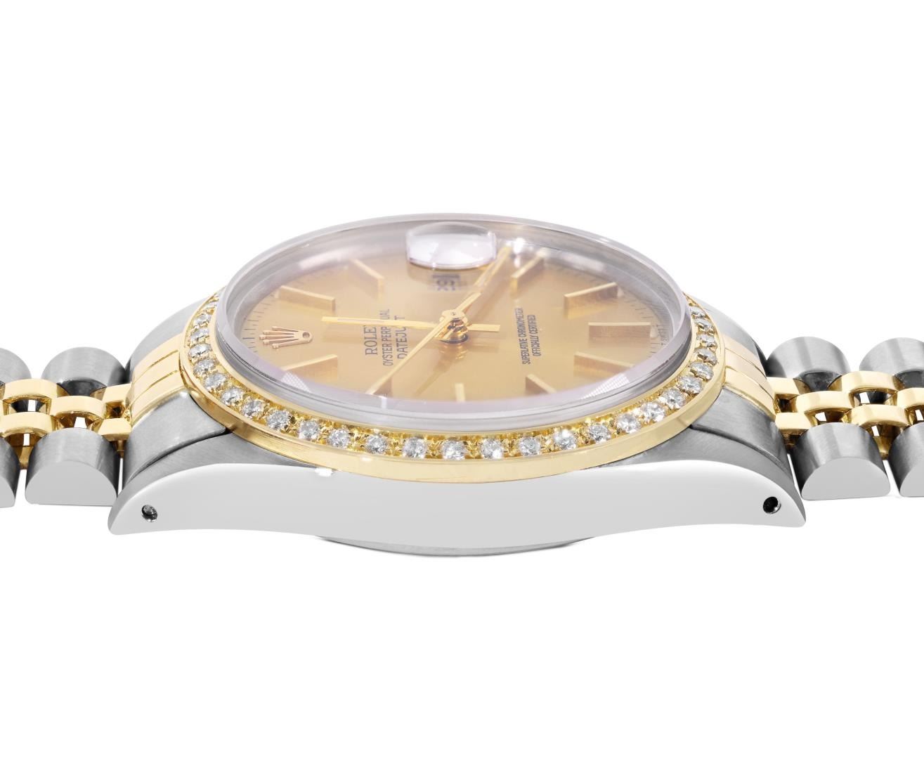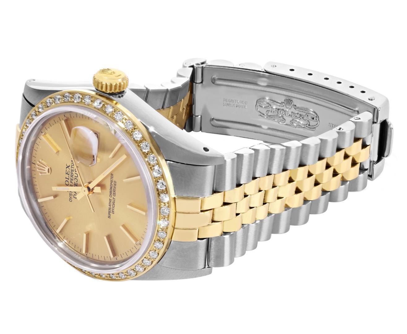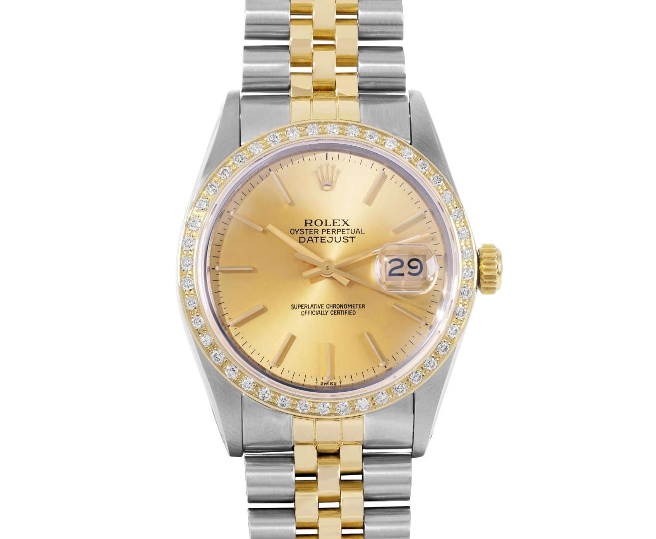 One Mens Pre Owned Yellow Gold Two Tone Rolex Datejust Polished, Serviced And Electronically Tested, Rolex Yellow Gold And Stainless Steel Case: 36mm, Rolex Yellow Gold Crown, Custom Bezel: New 18K Yellow Gold Beadset Diamond Bezel, Diamond Count: 44 Diamonds. Custom Crystal: New Sapphire With Magnified Date Window. Custom Hands: New Luminescent Hands. Rolex Movement: Automatic Winding Movement 3035. Rolex Dial: Champagne Dial With Index Hour Markers and Dash Track With Lumi Dots. Date Window: 3 O'Clock Position Date Display, Quickset, Model: Quickset Datejust. Condition: G-6 Extra Fine. Rolex Bracelet: Two Tone Yellow Gold And Stainless Steel Jubilee Band. Bright Polish. 7.0 Inch Length, Adjustable. Standard Clasp, With Rolex Logo. This Watch Has Been Serviced Time Tested And Is In Excellent Condition It Is Free Of All Scratches And Dents. This Watch Comes With A Rolex Box.