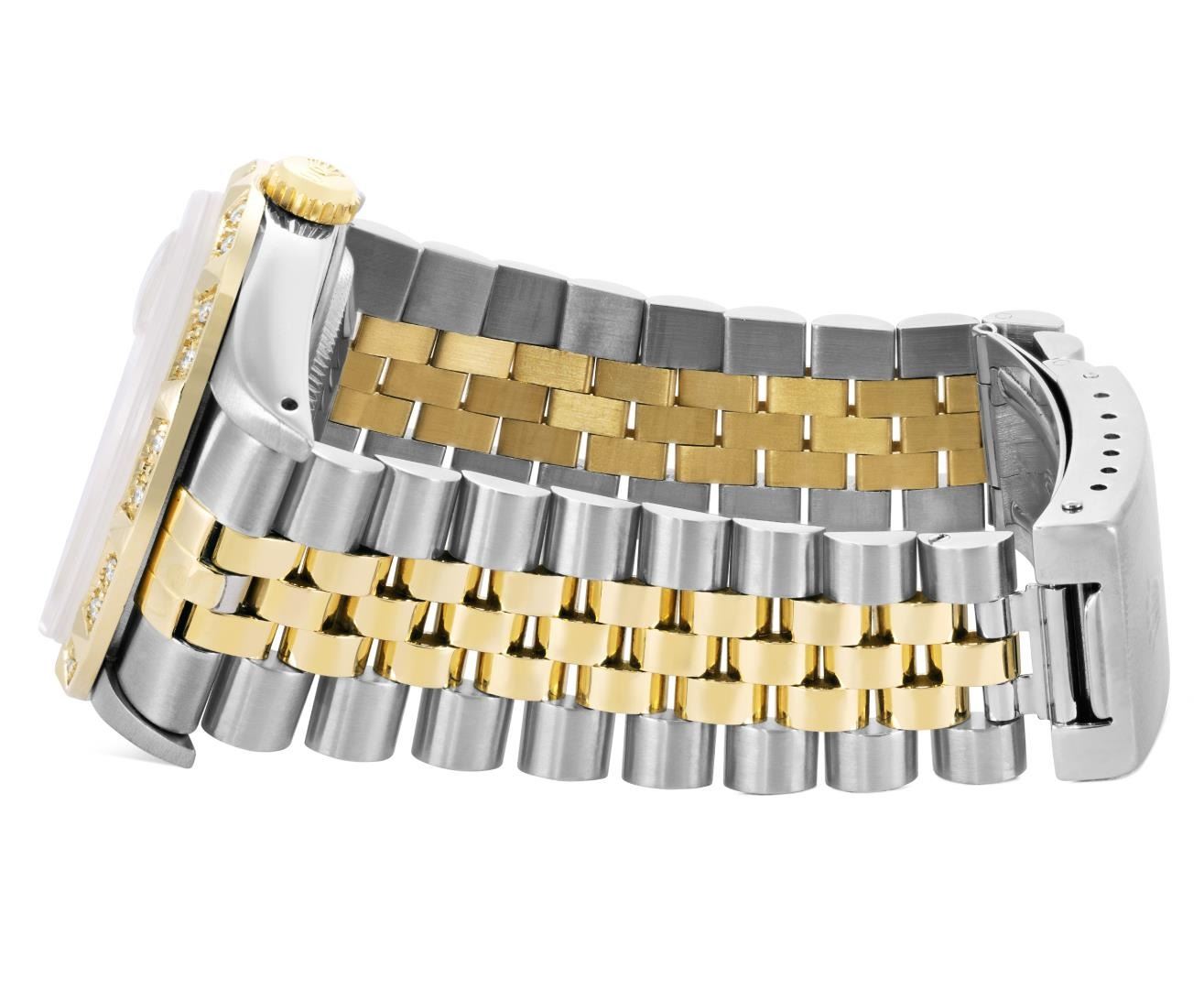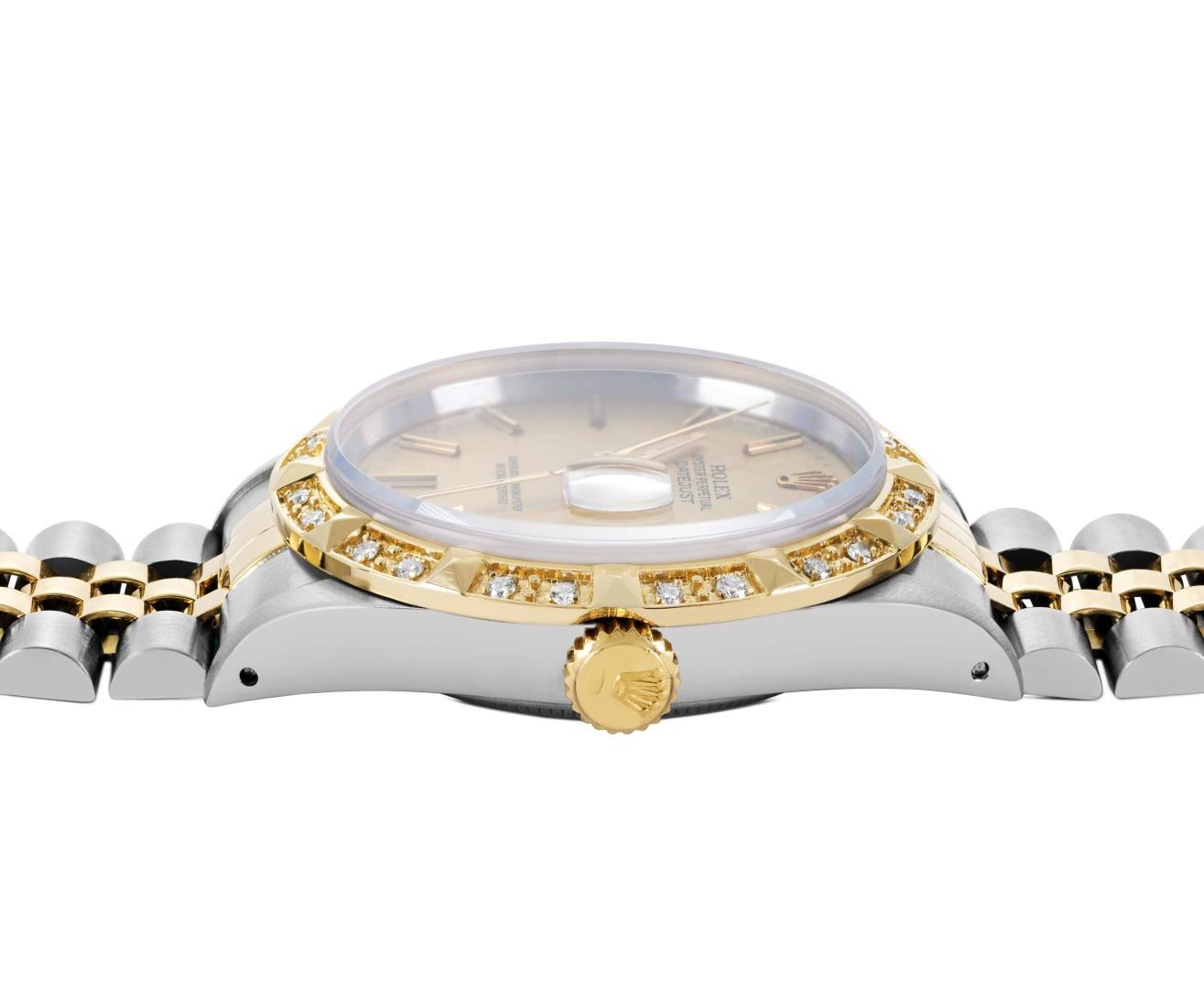 One Mens Pre Owned Yellow Gold Two Tone Rolex Datejust Polished, Serviced And Electronically Tested, Rolex Yellow Gold And Stainless Steel Case: 36mm, Rolex 14K Yellow Gold Crown, Custom Bezel: New 18K Yellow Gold Pyramid Diamond Bezel, Diamond Count: 24 Diamonds. Custom Crystal: New Sapphire With Magnified Date Window. Custom Hands: New Luminecent Hands. Rolex Movement: Automatic Winding Movement. Rolex Dial: Champagne Dial With Index Hour Markers and Small Track With Lumi Dots. Date Window: 3 O'Clock Position Date Display, Quickset, Model: Quickset Datejust. Condition: G-6 Extra Fine. Rolex Bracelet: Two Tone Yellow Gold And Stainless Steel Jubilee Band. Bright Polish. 7.0 Inch Length, Adjustable. Standard Clasp, With Rolex Logo. This Watch Has Been Serviced Time Tested And Is In Excellent Condition It Is Free Of All Scratches And Dents. This Watch Comes With A Rolex Box.