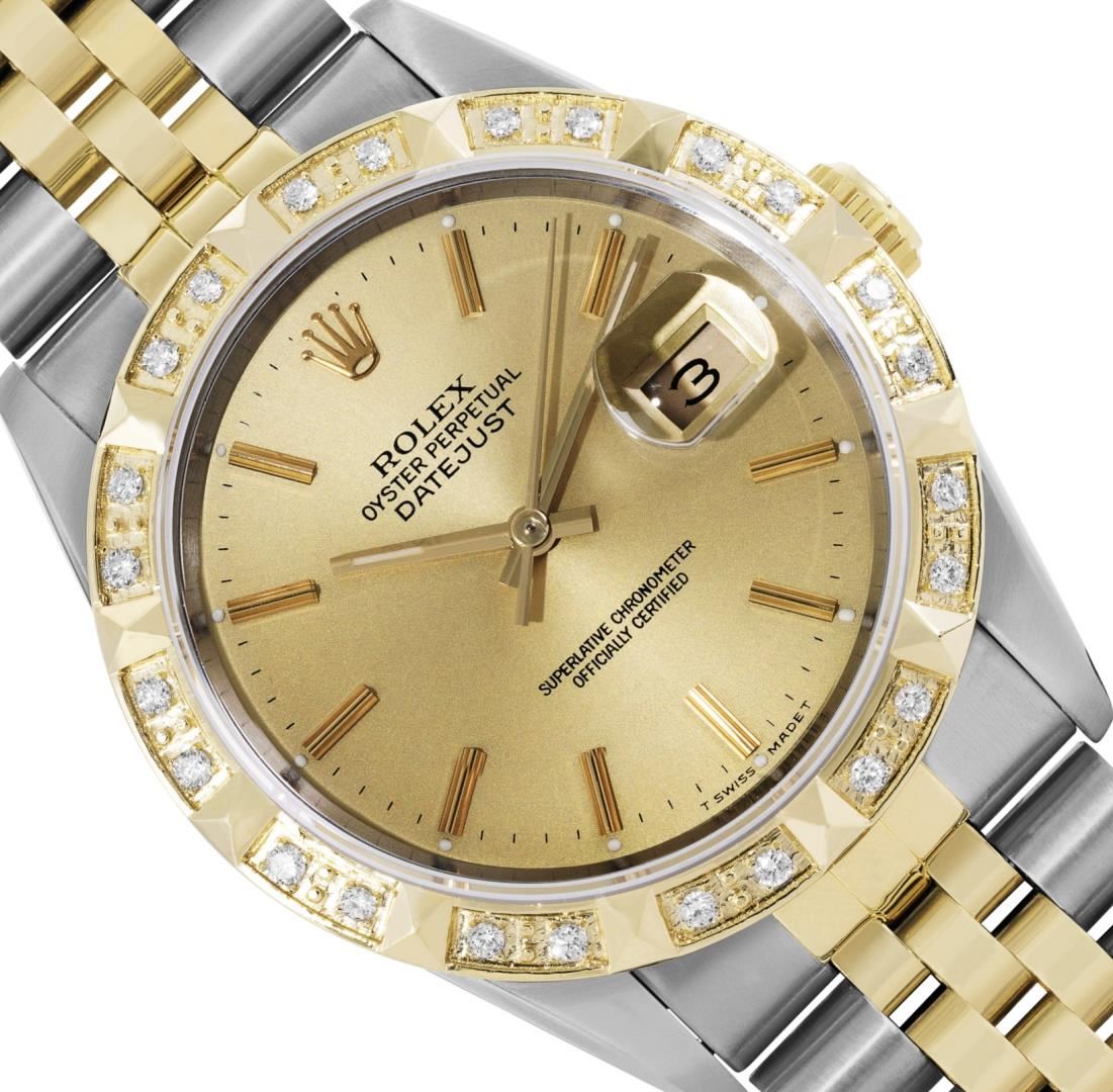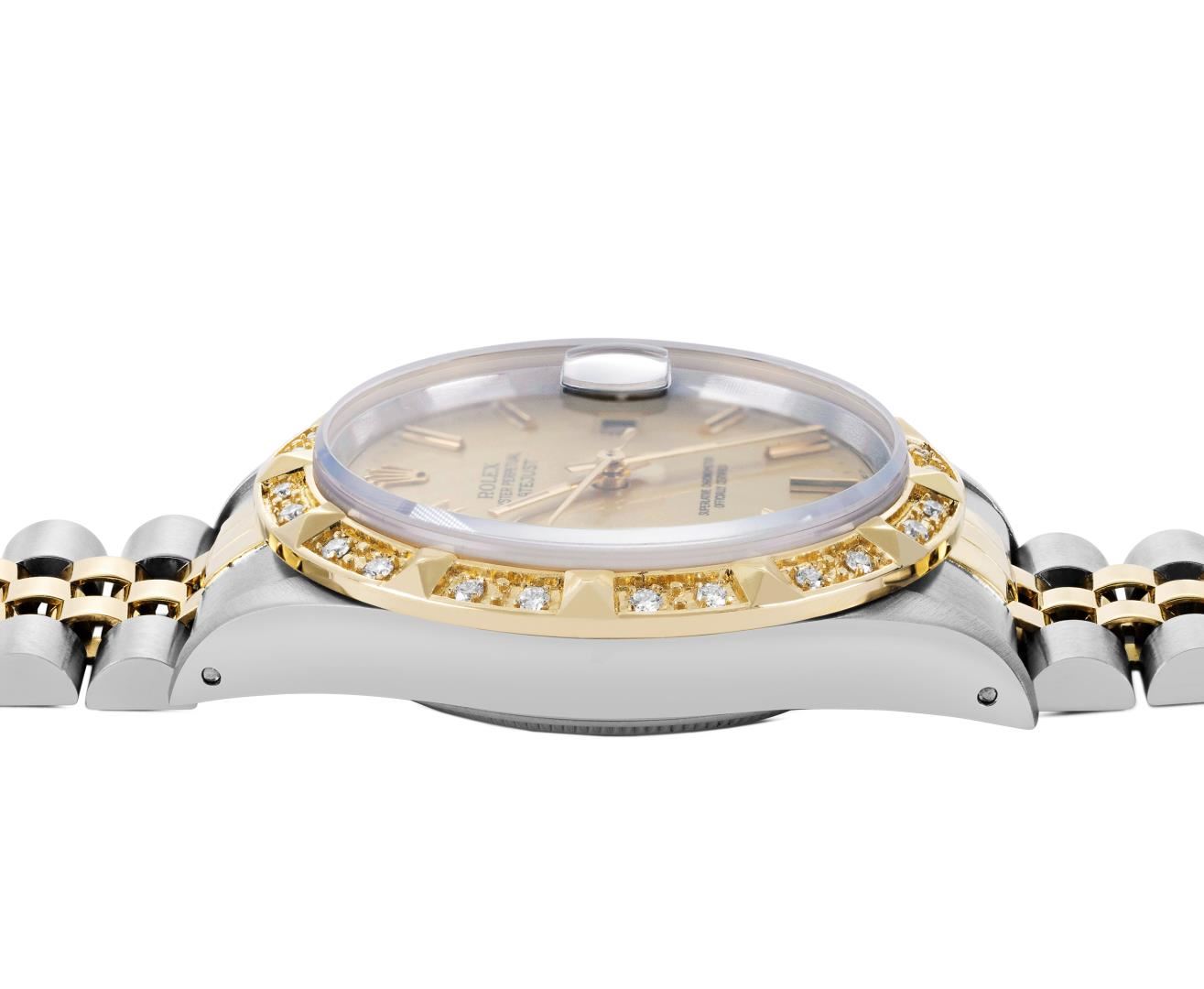 One Mens Pre Owned Yellow Gold Two Tone Rolex Datejust Polished, Serviced And Electronically Tested, Rolex Yellow Gold And Stainless Steel Case: 36mm, Rolex 14K Yellow Gold Crown, Custom Bezel: New 18K Yellow Gold Pyramid Diamond Bezel, Diamond Count: 24 Diamonds. Custom Crystal: New Sapphire With Magnified Date Window. Custom Hands: New Luminecent Hands. Rolex Movement: Automatic Winding Movement. Rolex Dial: Champagne Dial With Index Hour Markers and Small Track With Lumi Dots. Date Window: 3 O'Clock Position Date Display, Quickset, Model: Quickset Datejust. Condition: G-6 Extra Fine. Rolex Bracelet: Two Tone Yellow Gold And Stainless Steel Jubilee Band. Bright Polish. 7.0 Inch Length, Adjustable. Standard Clasp, With Rolex Logo. This Watch Has Been Serviced Time Tested And Is In Excellent Condition It Is Free Of All Scratches And Dents. This Watch Comes With A Rolex Box.