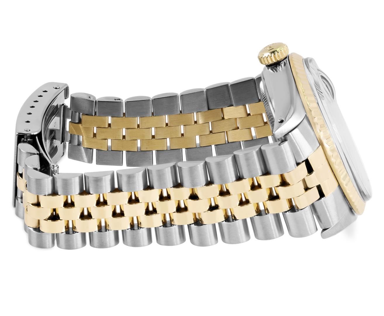 One Mens Pre Owned Yellow Gold Two Tone Rolex Datejust Polished, Serviced And Electronically Tested, Rolex Yellow Gold And Stainless Steel Case: 36mm, Rolex Yellow Gold Crown, Rolex Bezel: Yellow Gold Fluted Bezel. Custom Crystal: New Plastic With Magnified Date Window. Custom Hands: New Luminecent Hands. Rolex Movement: Automatic Winding Movement 3035. Rolex Dial: Champagne Dial With Index Hour Markers and Dash Track With Lumi Dots. Date Window: 3 O'Clock Position Date Display, Quickset, Model: Quickset Datejust. Condition: G-6 Extra Fine. Rolex Bracelet: Two Tone Yellow Gold And Stainless Steel Jubilee Band. Bright Polish. 7.0 Inch Length, Adjustable. Standard Clasp, With Rolex Logo. This Watch Has Been Serviced Time Tested And Is In Excellent Condition It Is Free Of All Scratches And Dents. This Watch Comes With A Rolex Box.