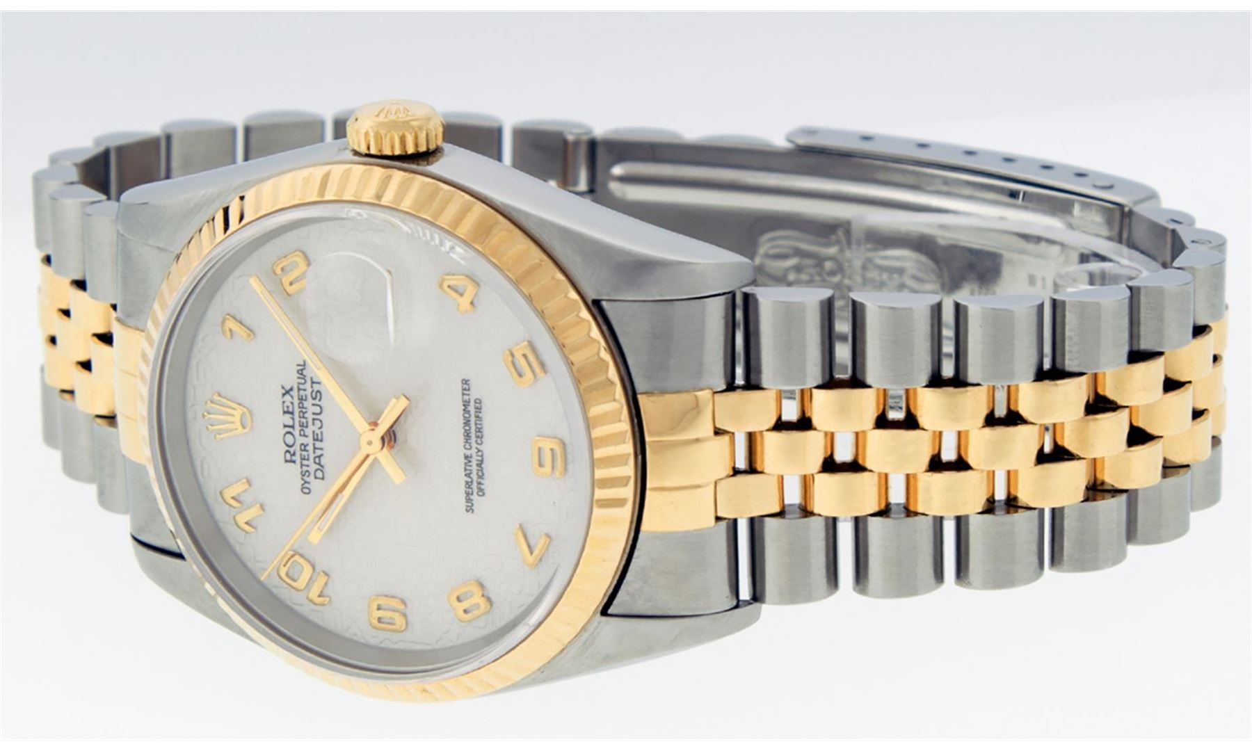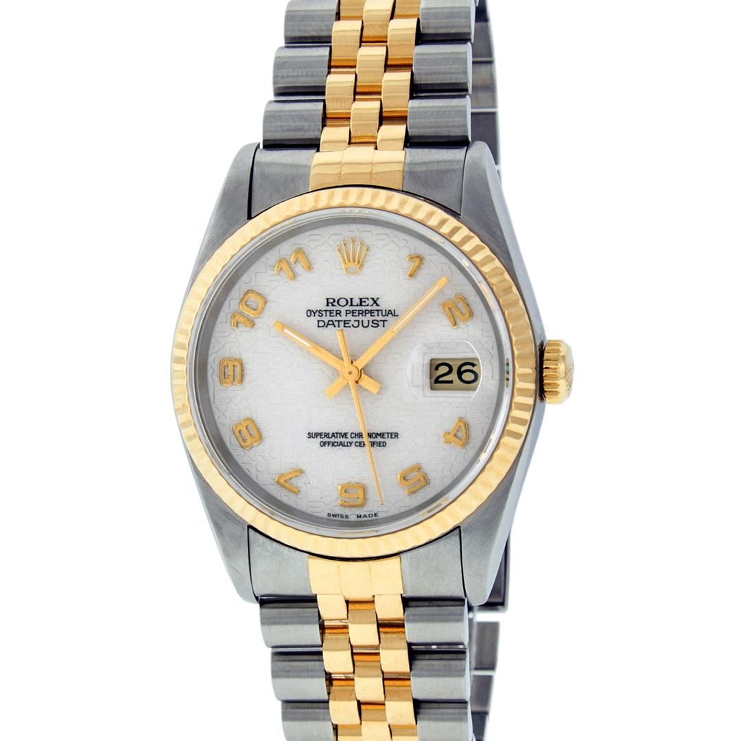 One Mens Rolex Two Tone 18K Yellow Gold And Stainless Steel Datejust Polished, Serviced & Electronically Tested, Yellow Gold & Stainless Steel Case: 36mm, 18K Yellow Gold Crown, Rolex Bezel: 18K Yellow Gold Fluted Bezel. Crystal: Sapphire With Magnified Date Window. Custom Hands: New Luminescent Hands. Rolex Movement: Automatic Winding Movement 3135. Rolex Dial: Cream Jubilee Dial With Arabic Hour Markers. Date Window: 3 O'Clock Position Date Display, Quickset, Model: Datejust. Condition: G-6 Extra Fine. Rolex Bracelet: Two Tone 18K Yellow Gold & Stainless Steel Jubilee Band. Bright Polish. 7.0 Inch Length, Adjustable. Standard Clasp, With Rolex Logo. This Watch Has Been Serviced Time Tested And Is In Excellent Condition It Is Free Of All Scratches And Dents.