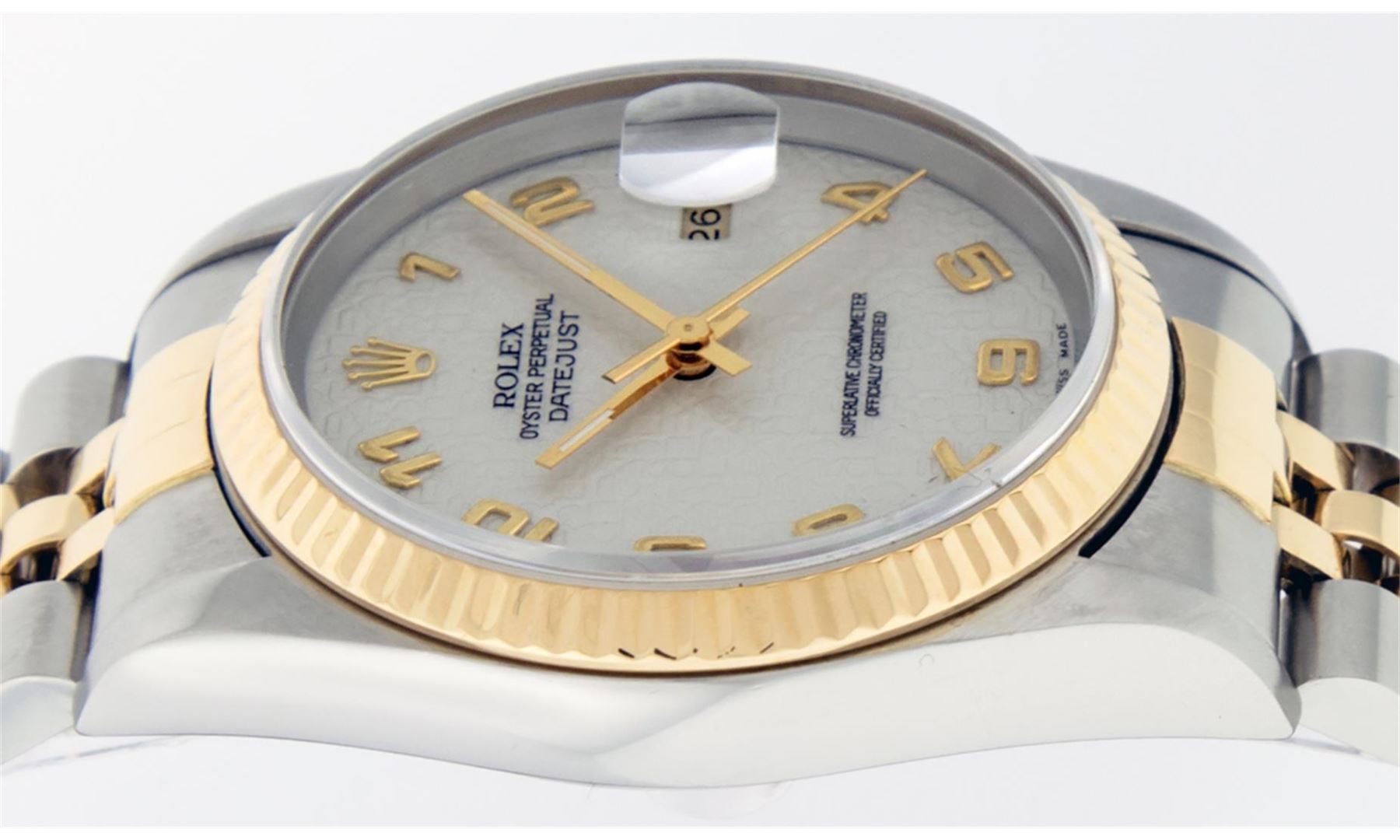 One Mens Rolex Two Tone 18K Yellow Gold And Stainless Steel Datejust Polished, Serviced & Electronically Tested, Yellow Gold & Stainless Steel Case: 36mm, 18K Yellow Gold Crown, Rolex Bezel: 18K Yellow Gold Fluted Bezel. Crystal: Sapphire With Magnified Date Window. Custom Hands: New Luminescent Hands. Rolex Movement: Automatic Winding Movement 3135. Rolex Dial: Cream Jubilee Dial With Arabic Hour Markers. Date Window: 3 O'Clock Position Date Display, Quickset, Model: Datejust. Condition: G-6 Extra Fine. Rolex Bracelet: Two Tone 18K Yellow Gold & Stainless Steel Jubilee Band. Bright Polish. 7.0 Inch Length, Adjustable. Standard Clasp, With Rolex Logo. This Watch Has Been Serviced Time Tested And Is In Excellent Condition It Is Free Of All Scratches And Dents.