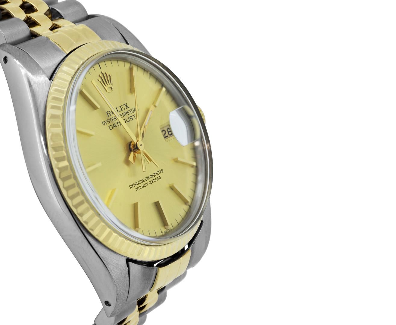 One Mens Pre Owned Yellow Gold Two Tone Rolex Datejust Polished, Serviced And Electronically Tested, Rolex Yellow Gold And Stainless Steel Case: 36mm, Rolex Yellow Gold Crown, Rolex Bezel: Yellow Gold Fluted Bezel. Custom Crystal: New Plastic With Magnified Date Window. Custom Hands: New Luminecent Hands. Rolex Movement: Automatic Winding Movement 3035. Rolex Dial: Champagne Dial With Index Hour Markers and Dash Track With Lumi Dots. Date Window: 3 O'Clock Position Date Display, Quickset, Model: Datejust. Condition: G-6 Extra Fine. Rolex Bracelet: Two Tone Yellow Gold And Stainless Steel Jubilee Band. Bright Polish. 7.0 Inch Length, Adjustable. Standard Clasp, With Rolex Logo. This Watch Has Been Serviced Time Tested And Is In Excellent Condition It Is Free Of All Scratches And Dents. This Watch Comes With A Rolex Box.