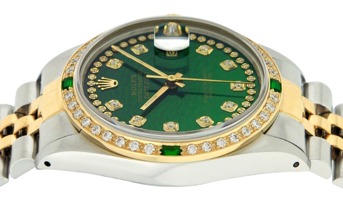 One Mens Rolex Datejust Polished Bright with Satin Finish, Serviced & Electronically Tested, 14K Yellow Gold And Stainless Steel Case:36mm, Stainless Steel Crown, Custom Bezel: 18K Yellow Gold Diamond & Emerald Beadset Bezel, Diamond Count: 36 Diamonds + 4 Emerald Baguettes, Total Weight 1.0 Carat, Clarity: SI-VS, Color: G to H. Custom Crystal: Synthetic Sapphire Cyclops Lens. Movement: Automatic Winding Movement Caliber 3035. Custom Dial: Green String Diamond Dial, Diamond Count: 58 Diamond in Dial, Dial Color: G To H In Color, Clarity: VS2-SI1. Date Window: 3 O'Clock Position Date Display, Quickset, Model: 16013 Condition: G-6 Extra Fine. Bracelet: 14K Yellow Gold And Stainless Steel Jubilee. Bright Polish & Satin Finish. 7.0 Inch Length, Adjustable. Standard Clasp, With Rolex Logo. This Watch Has Been Serviced and Polished And It Is Free Of All Dents And Scratches And Has Been Time Tested.