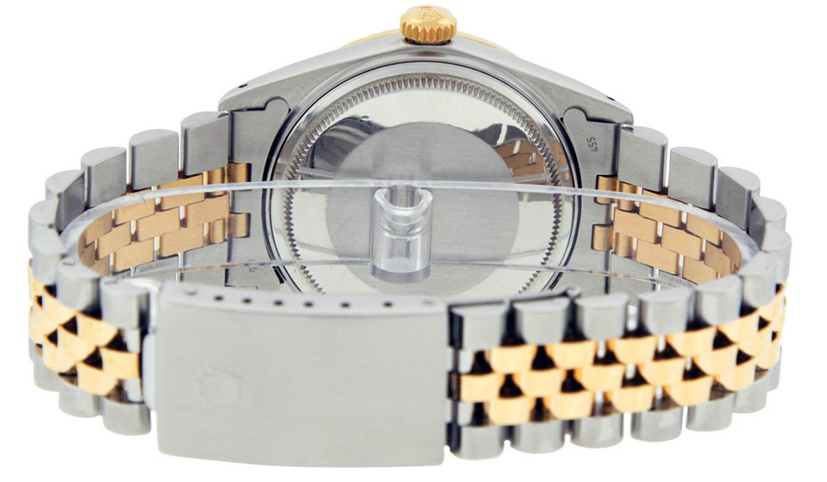 One Mens Rolex Datejust Polished Bright with Satin Finish, Serviced & Electronically Tested, 14K Yellow Gold And Stainless Steel Case:36mm, Stainless Steel Crown, Custom Bezel: 18K Yellow Gold Diamond & Emerald Beadset Bezel, Diamond Count: 36 Diamonds + 4 Emerald Baguettes, Total Weight 1.0 Carat, Clarity: SI-VS, Color: G to H. Custom Crystal: Synthetic Sapphire Cyclops Lens. Movement: Automatic Winding Movement Caliber 3035. Custom Dial: Green String Diamond Dial, Diamond Count: 58 Diamond in Dial, Dial Color: G To H In Color, Clarity: VS2-SI1. Date Window: 3 O'Clock Position Date Display, Quickset, Model: 16013 Condition: G-6 Extra Fine. Bracelet: 14K Yellow Gold And Stainless Steel Jubilee. Bright Polish & Satin Finish. 7.0 Inch Length, Adjustable. Standard Clasp, With Rolex Logo. This Watch Has Been Serviced and Polished And It Is Free Of All Dents And Scratches And Has Been Time Tested.