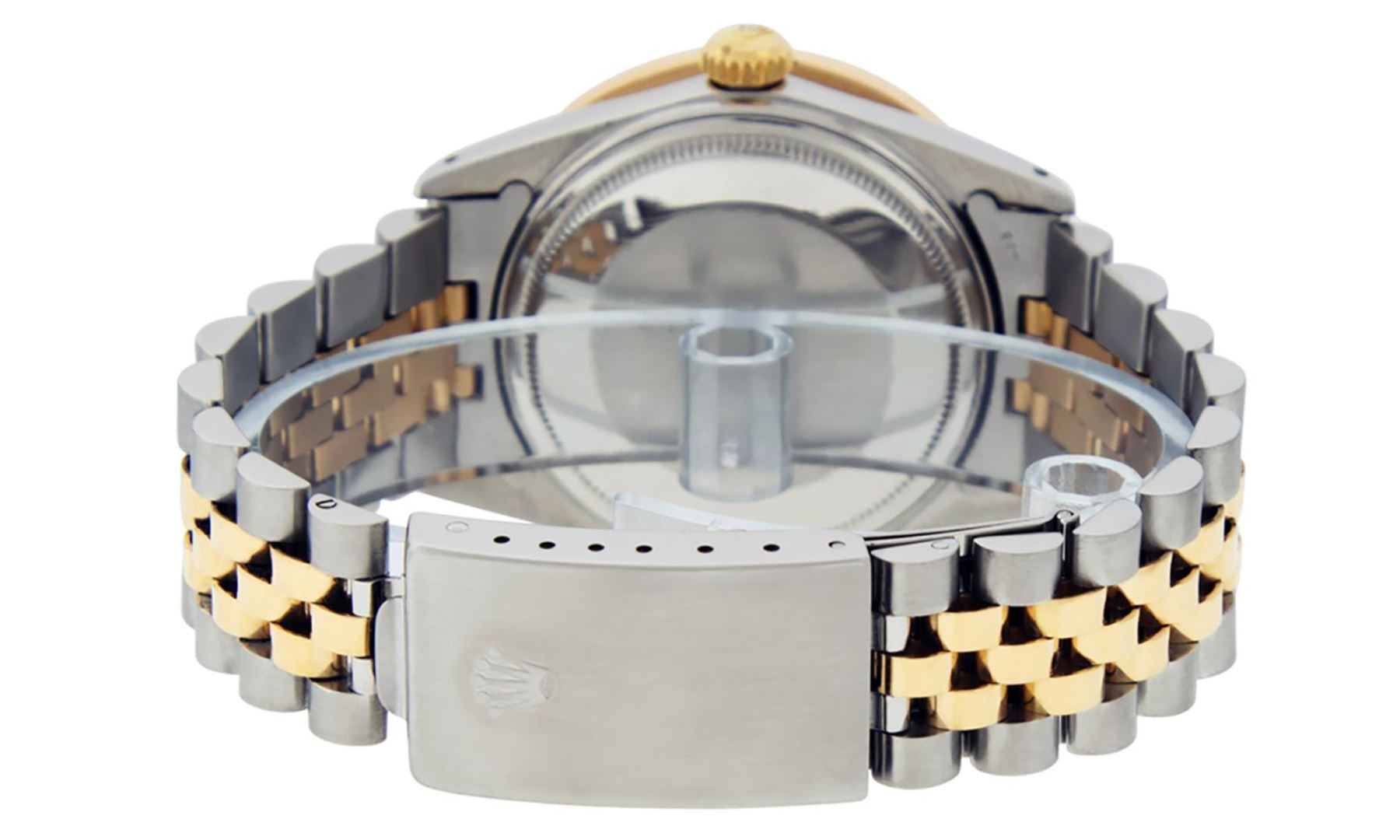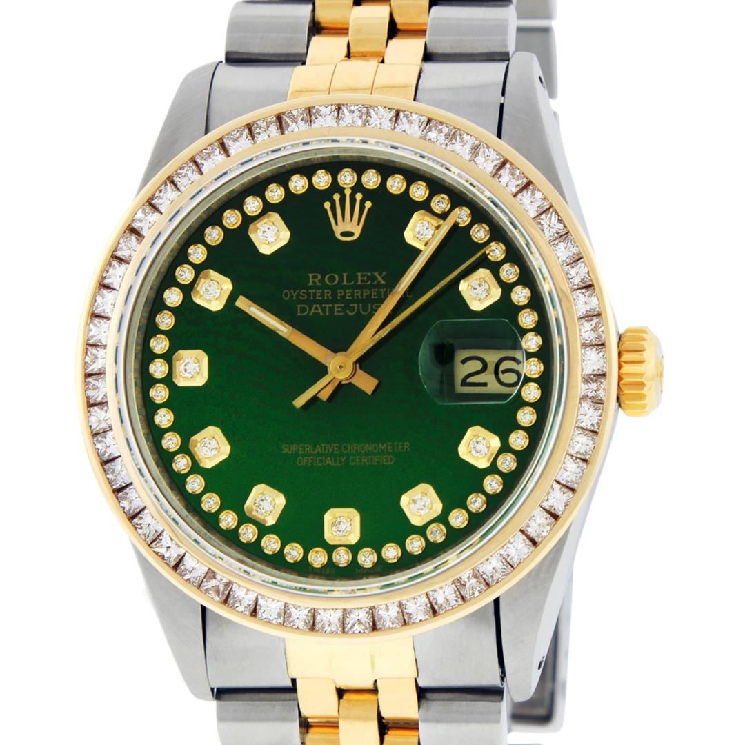 One Mens Pre Owned Two Tone Yellow Gold And Stainless Steel Rolex Datejust Polished Bright with Satin Finish, Serviced And Electronically Tested, Rolex Yellow Gold And Stainless Steel Case: 36mm, Rolex Yellow Gold Crown, Custom Bezel: New 14K Yellow Gold Princess Cut Diamond Bezel, Diamond Count: 53 Diamonds, Total Weight 2.75 Carat. Custom Crystal: New Sapphire With Magnified Date. Custom Hands: New Luminescent Hands. Rolex Movement: Automatic Winding Movement 3035. Custom Dial: Custom Green Dial With Added Diamonds, Diamond Count: 58 Diamond On Dial. Date Window: 3 O'Clock Position Date Display, Quickset, Model: Datejust. Condition: G-6 Extra Fine. Rolex Bracelet: Yellow Gold And Stainless Steel Jubilee Band. Bright Polish And Satin Finish. 7.0 Inch Length, Adjustable. Standard Clasp, With Rolex Logo. This Watch Has Been Serviced and Polished And It Is Free Of All Dents And Scratches And Has Been Time Tested.