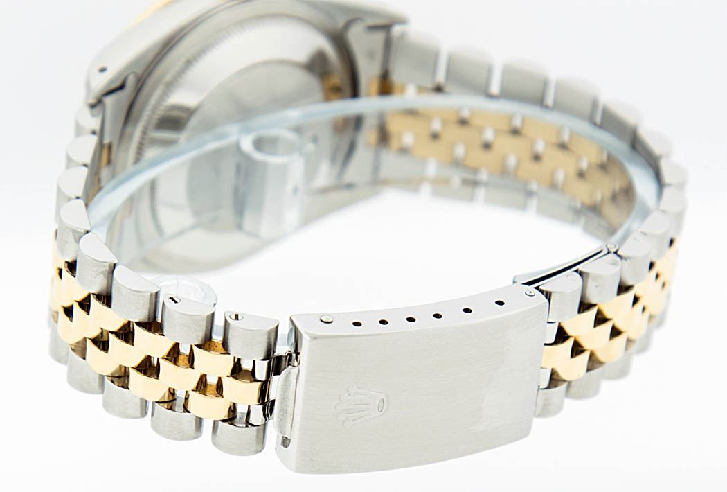 One Mens Two Tone Rolex Datejust Polished, Serviced & Electronically Tested, 14K Yellow Gold & Stainless Steel Case:36mm, 14K Yellow Gold Crown, Custom Bezel: 18K Yellow Gold Sapphire Channel Set Diamond Bezel, Diamond Count: 52 Diamonds + 4 Sapphires, Total Weight 1.30 Carat, Clarity: SI-VS, Color: G to H. Custom Crystal: Synthetic Sapphire Cyclops Lens. Movement: Automatic Winding Movement Caliber 3035. Custom Dial: Mother Of Pearl Dial With Sapphire Hour Markers, Stone Count: 10 Sapphires in Dial. Date Window: 3 O'Clock Position Date Display, Quickset, Model: 16013 Condition: G-6 Extra Fine. Bracelet:Two Tone 14K Yellow Gold & Stainless Steel Jubilee. Bright Polish. 7.0 Inch Length, Adjustable. Standard Clasp, With Rolex Logo.