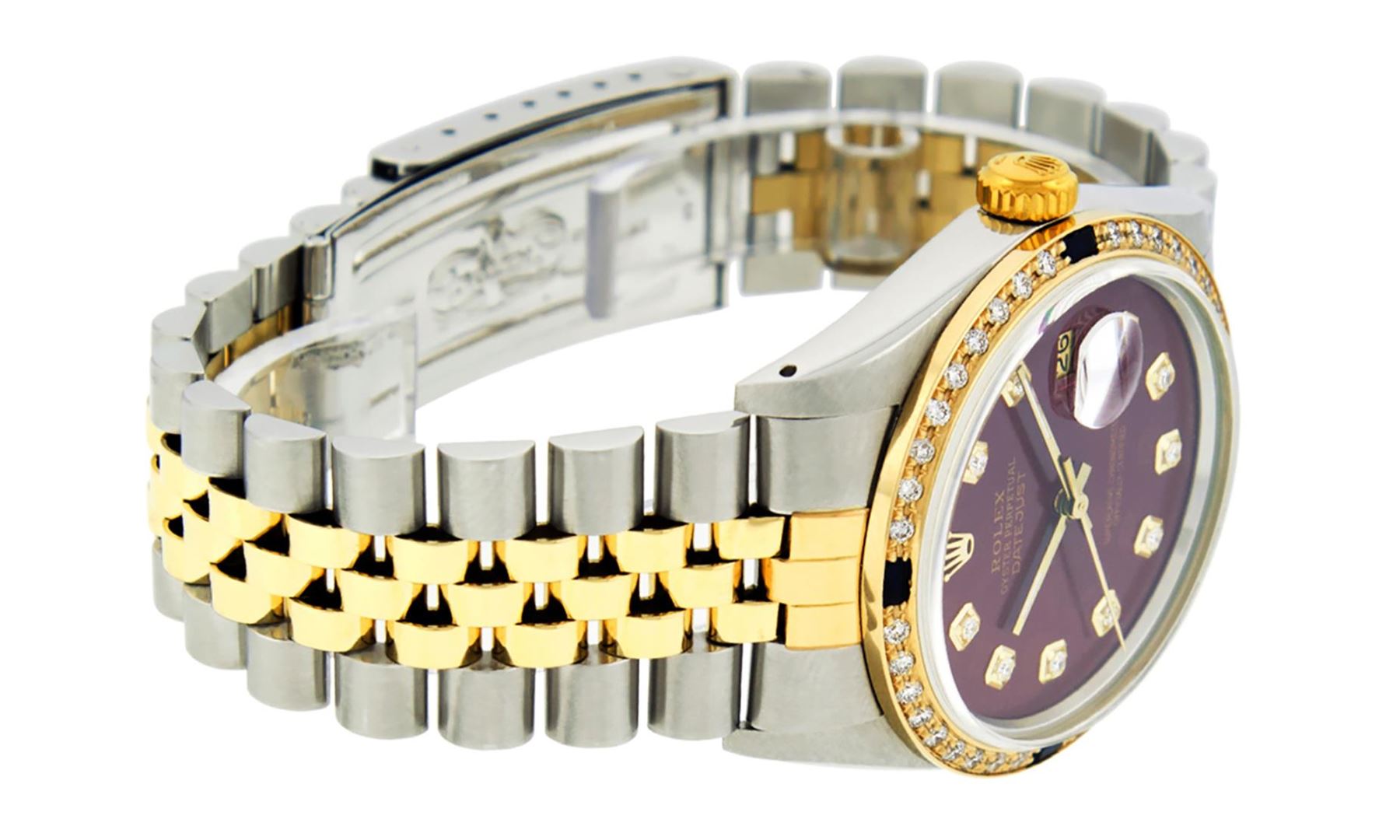 One Mens Pre Owned Two Tone Yellow Gold And Stainless Steel Rolex Datejust Polished, Serviced And Electronically Tested, Rolex Yellow Gold And Stainless Steel Case: 36mm, Rolex Yellow Gold Crown, Custom Bezel: New 18K Yellow Gold Sapphire Beadset Diamond Bezel, Stone Count: 36 Diamonds + 4 Sapphires. Custom Crystal: New Sapphire With Magnified Date Window. Custom Hands: New Luminescent Hands. Rolex Movement: Automatic Winding Movement 3035. Custom Dial: Custom Maroon Dial With Added Diamonds, Diamond Count: 10 Diamonds. Date Window: 3 O'Clock Position Date Display, Quickset, Model: Datejust. Condition: G-6 Extra Fine. Rolex Bracelet: Two Tone Yellow Gold And Stainless Steel Jubilee Band. Bright Polish. 7.0 Inch Length, Adjustable. Standard Clasp, With Rolex Logo. This Watch Has Been Serviced Time Tested And Is In Excellent Condition It Is Free Of All Scratches And Dents.