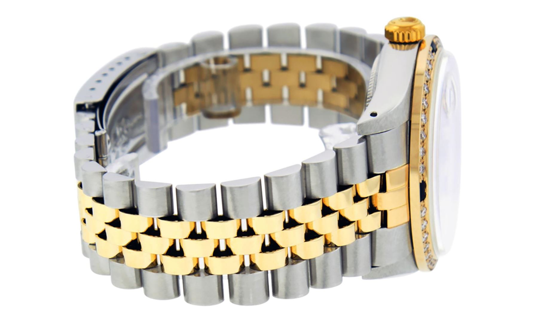 One Mens Pre Owned Two Tone Yellow Gold And Stainless Steel Rolex Datejust Polished, Serviced And Electronically Tested, Rolex Yellow Gold And Stainless Steel Case: 36mm, Rolex Yellow Gold Crown, Custom Bezel: New 18K Yellow Gold Sapphire Beadset Diamond Bezel, Stone Count: 36 Diamonds + 4 Sapphires. Custom Crystal: New Sapphire With Magnified Date Window. Custom Hands: New Luminescent Hands. Rolex Movement: Automatic Winding Movement 3035. Custom Dial: Custom Maroon Dial With Added Diamonds, Diamond Count: 10 Diamonds. Date Window: 3 O'Clock Position Date Display, Quickset, Model: Datejust. Condition: G-6 Extra Fine. Rolex Bracelet: Two Tone Yellow Gold And Stainless Steel Jubilee Band. Bright Polish. 7.0 Inch Length, Adjustable. Standard Clasp, With Rolex Logo. This Watch Has Been Serviced Time Tested And Is In Excellent Condition It Is Free Of All Scratches And Dents.