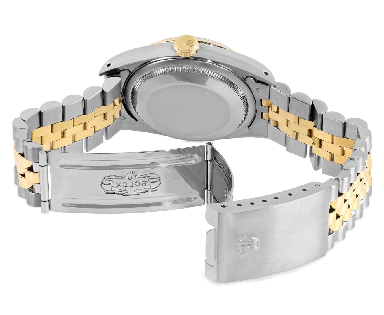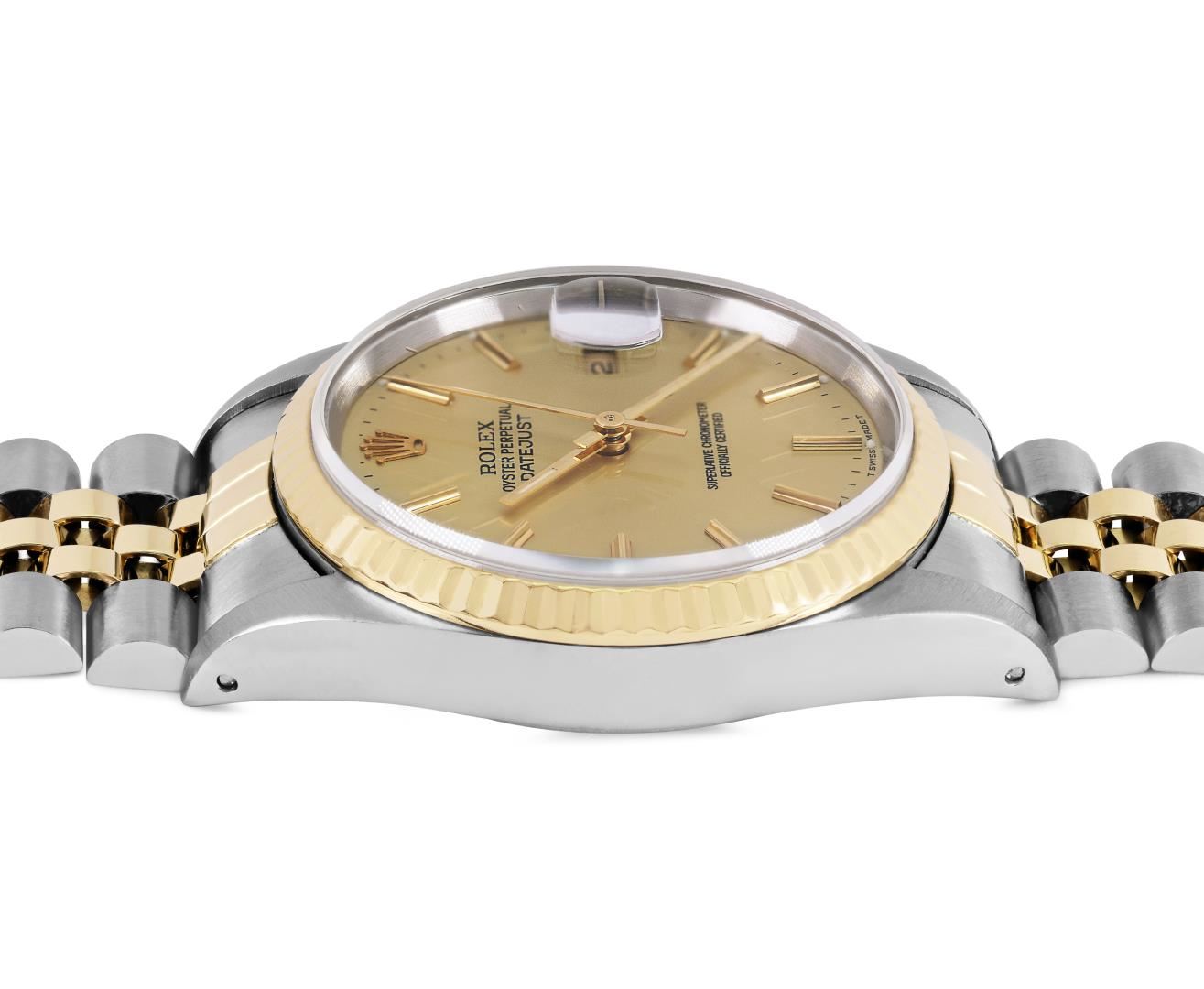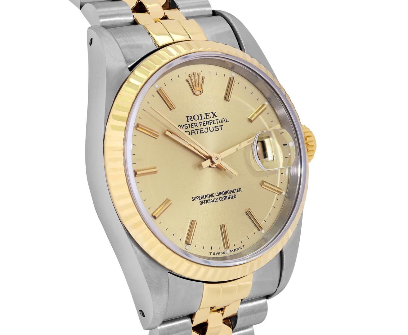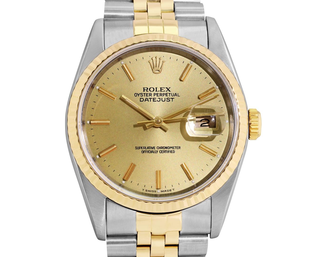 One Mens Pre Owned Yellow Gold Two Tone Rolex Datejust Polished, Serviced And Electronically Tested, Rolex Yellow Gold And Stainless Steel Case: 36mm, Rolex Yellow Gold Crown, Rolex Bezel: 18K Yellow Gold Fluted Bezel. Crystal: Sapphire With Magnified Date Window. Hands: Luminescent Hands. Rolex Movement: Automatic Winding Movement 3135. Rolex Dial: Champagne Dial With Index Hour Markers and Dash Track With Lumi Dots. Date Window: 3 O'Clock Position Date Display, Quickset, Model: Quickset Sapphire Datejust. Condition: G-6 Extra Fine. Rolex Bracelet: Two Tone Yellow Gold And Stainless Steel Jubilee Band. Bright Polish. 7.0 Inch Length, Adjustable. Standard Clasp, With Rolex Logo. This Watch Has Been Serviced Time Tested And Is In Excellent Condition It Is Free Of All Scratches And Dents. This Watch Comes With A Rolex Box.