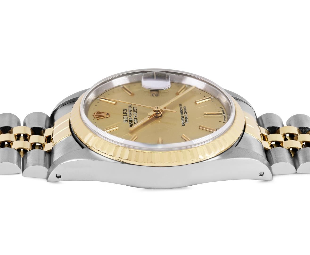 One Mens Pre Owned Yellow Gold Two Tone Rolex Datejust Polished, Serviced And Electronically Tested, Rolex Yellow Gold And Stainless Steel Case: 36mm, Rolex Yellow Gold Crown, Rolex Bezel: 18K Yellow Gold Fluted Bezel. Crystal: Sapphire With Magnified Date Window. Hands: Luminescent Hands. Rolex Movement: Automatic Winding Movement 3135. Rolex Dial: Champagne Dial With Index Hour Markers and Dash Track With Lumi Dots. Date Window: 3 O'Clock Position Date Display, Quickset, Model: Quickset Sapphire Datejust. Condition: G-6 Extra Fine. Rolex Bracelet: Two Tone Yellow Gold And Stainless Steel Jubilee Band. Bright Polish. 7.0 Inch Length, Adjustable. Standard Clasp, With Rolex Logo. This Watch Has Been Serviced Time Tested And Is In Excellent Condition It Is Free Of All Scratches And Dents. This Watch Comes With A Rolex Box.