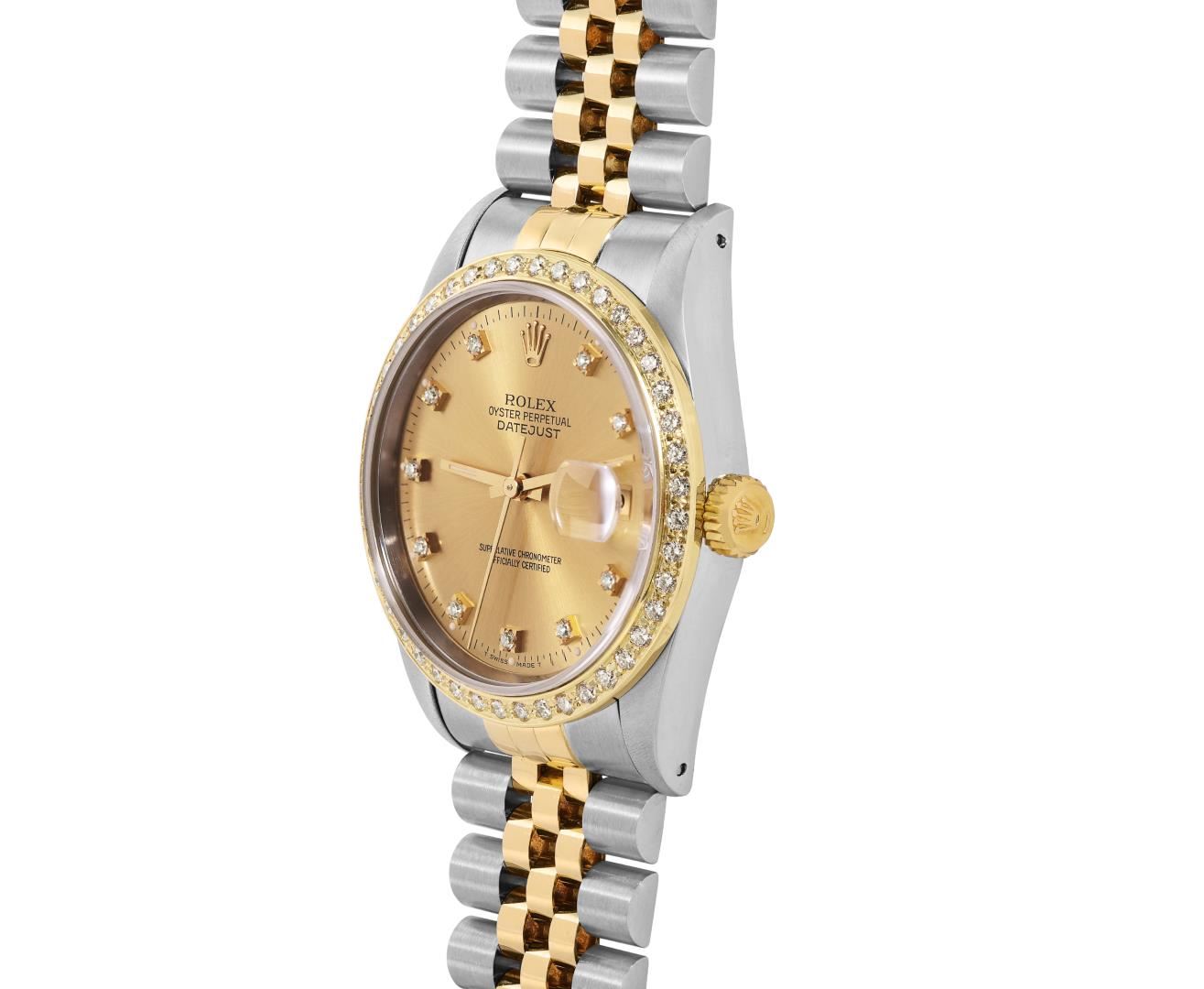One Mens Pre Owned Two Tone 18K Yellow Gold And Stainless Steel Rolex Datejust Polished, Serviced And Electronically Tested, Rolex Yellow Gold And Stainless Steel Case: 36mm, Rolex Yellow Gold Crown, Custom Bezel: New 18K Yellow Gold Beadset Diamond Bezel, Diamond Count: 44 Diamonds. Custom Crystal: New Sapphire With Magnified Date Window. Custom Hands: New Luminecent Hands. Rolex Movement: Automatic Winding Movement 3135. Rolex Dial: Factory Champagne Dial With Diamond Hour Markers and Dash Track With Lumi Dots, Diamond Count: 10 Diamonds On Dial. Date Window: 3 O'Clock Position Date Display, Quickset, Model: Quickset Datejust. Condition: G-6 Extra Fine. Rolex Bracelet: Two Tone 18K Yellow Gold And Stainless Steel Jubilee Band. Bright Polish. 7.0 Inch Length, Adjustable. Standard Clasp, With Rolex Logo. This Watch Has Been Serviced Time Tested And Is In Excellent Condition It Is Free Of All Scratches And Dents.
