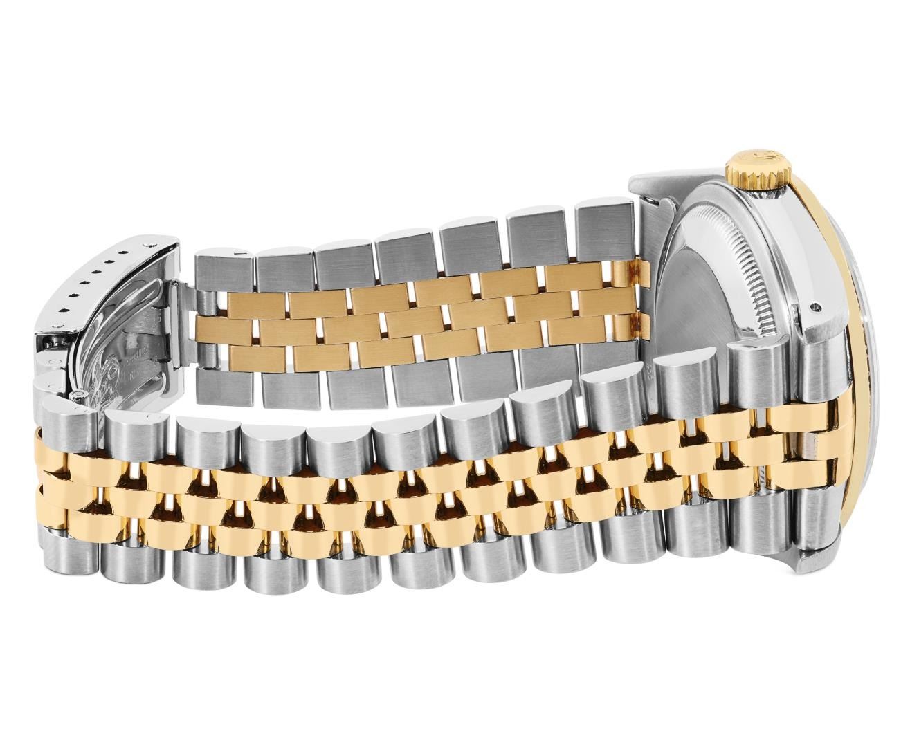 One Mens Pre Owned Two Tone 18K Yellow Gold And Stainless Steel Rolex Datejust Polished, Serviced And Electronically Tested, Rolex Yellow Gold And Stainless Steel Case: 36mm, Rolex Yellow Gold Crown, Custom Bezel: New 18K Yellow Gold Beadset Diamond Bezel, Diamond Count: 44 Diamonds. Custom Crystal: New Sapphire With Magnified Date Window. Custom Hands: New Luminecent Hands. Rolex Movement: Automatic Winding Movement 3135. Rolex Dial: Factory Champagne Dial With Diamond Hour Markers and Dash Track With Lumi Dots, Diamond Count: 10 Diamonds On Dial. Date Window: 3 O'Clock Position Date Display, Quickset, Model: Quickset Datejust. Condition: G-6 Extra Fine. Rolex Bracelet: Two Tone 18K Yellow Gold And Stainless Steel Jubilee Band. Bright Polish. 7.0 Inch Length, Adjustable. Standard Clasp, With Rolex Logo. This Watch Has Been Serviced Time Tested And Is In Excellent Condition It Is Free Of All Scratches And Dents.