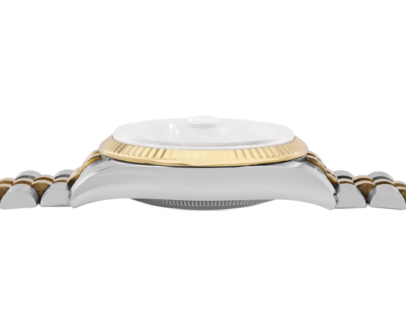 One Mens Pre Owned 18K Yellow Gold And Stainless Steel Rolex Datejust 36MM Polished, Serviced And Electronically Tested, Rolex Yellow Gold And Stainless Steel Case: 36mm, Rolex Yellow Gold Crown, Rolex Bezel: New 18K Yellow Gold Fluted Bezel. Crystal: Sapphire With Magnified Date Window. Rolex Hands: Solid Hands. Rolex Movement: Automatic Winding Movement 3235. Rolex Dial: Factory Champagne Diamond Dial, Diamond Count: 10 Diamonds On Dial, Clarity: VVS. Date Window: 3 O'Clock Position Date Display, Quickset, Model: Quickset Sapphire Datejust. Condition: G-6 Extra Fine. Rolex Bracelet: Two Tone 18K Yellow Gold And Stainless Steel Jubilee Band. Bright Polish. 7.0 Inch Length, Adjustable. Hidden Clasp, With Rolex Logo. This Watch Has Been Serviced And Polished It Is Free Of All Scratches And Dents. This Watch Comes With A Rolex Box.