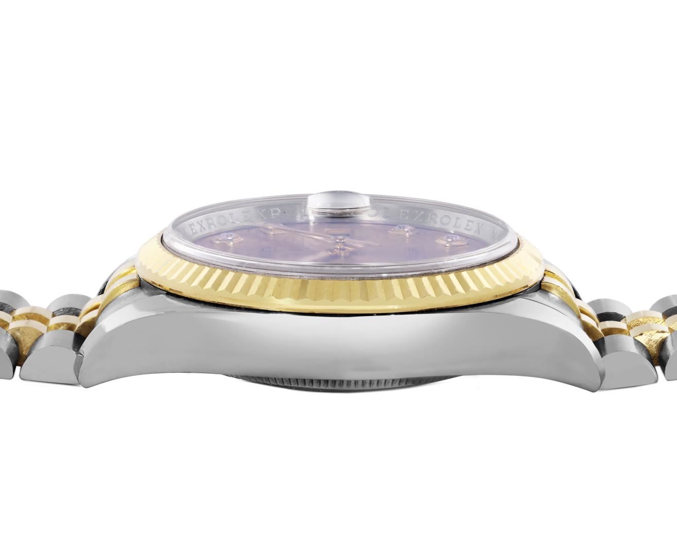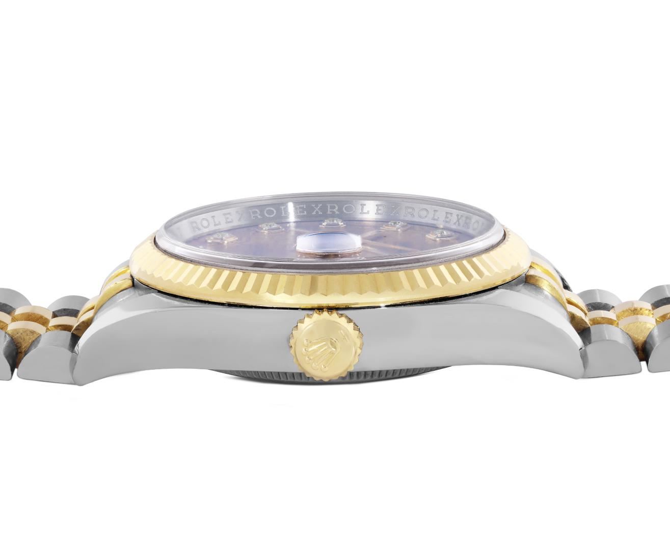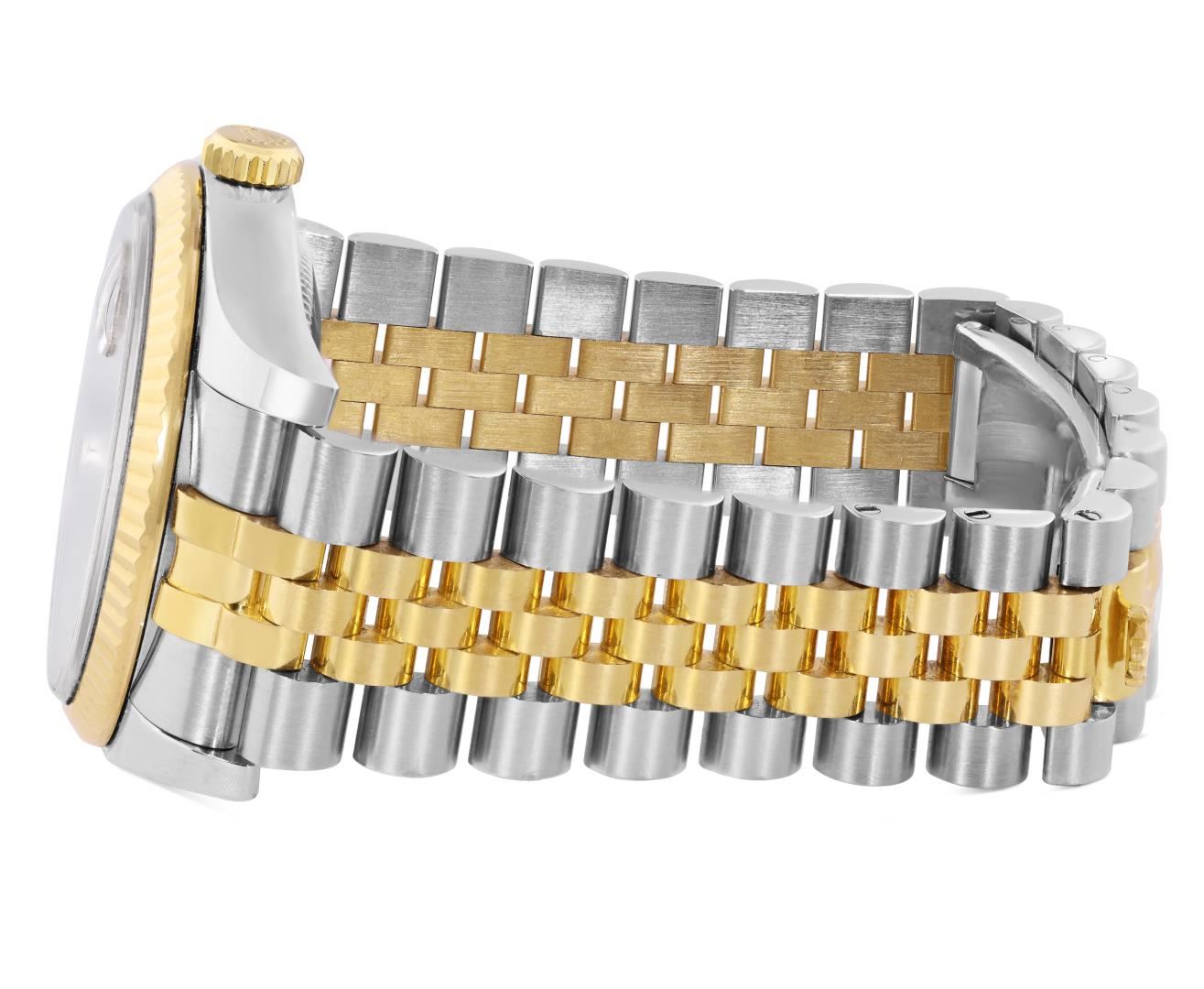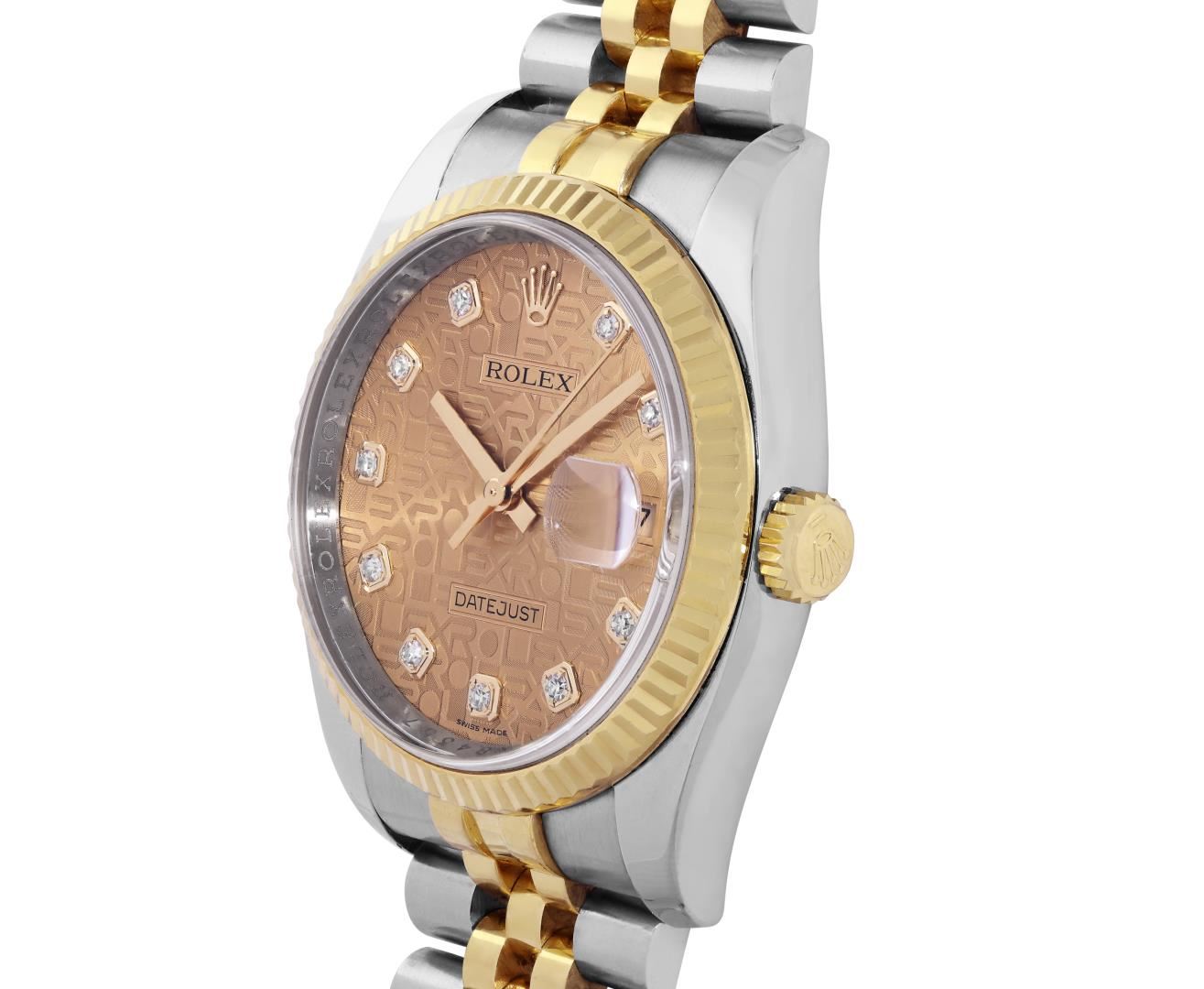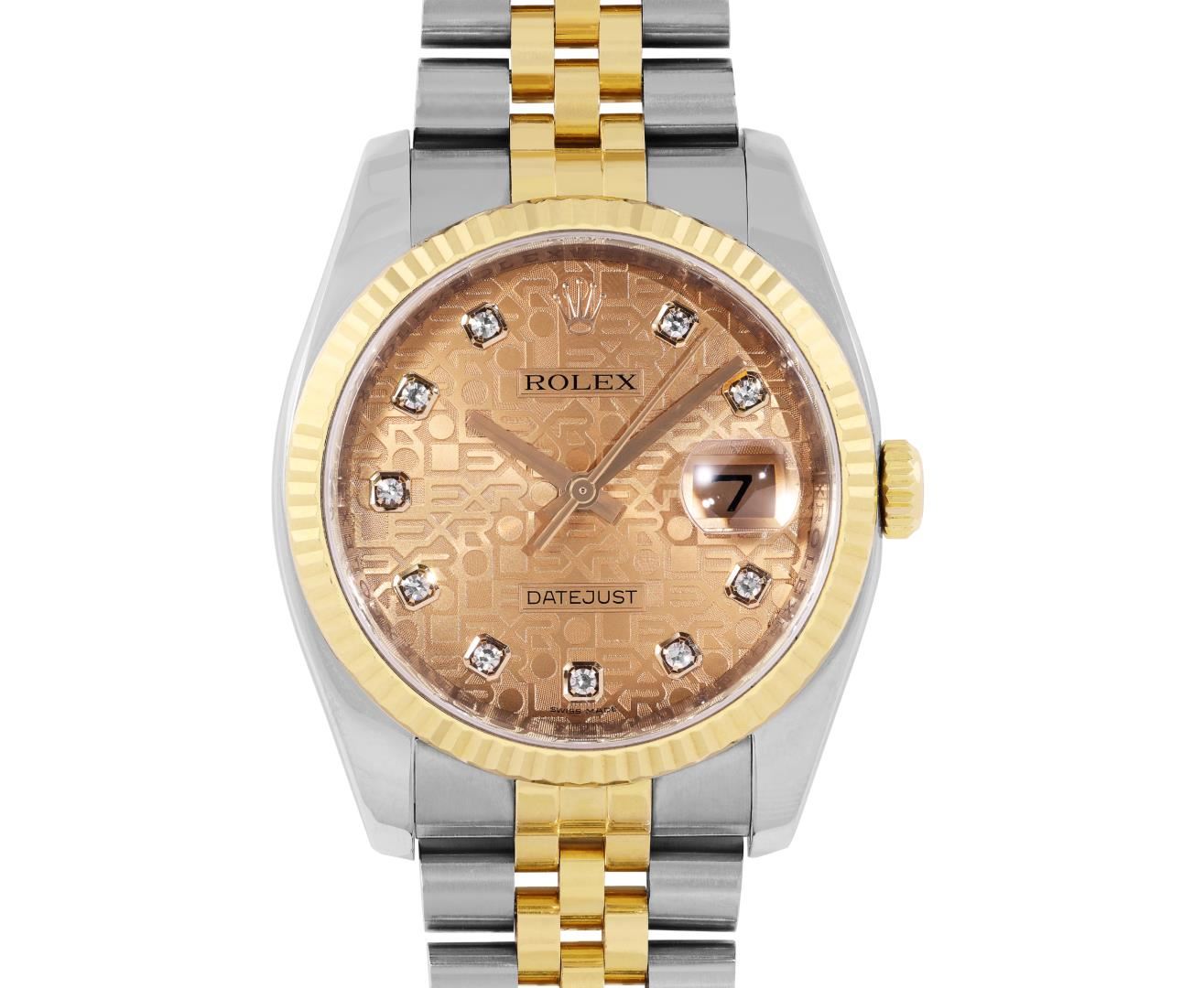 One Mens Pre Owned 18K Yellow Gold And Stainless Steel Rolex Datejust 36MM Polished, Serviced & Electronically Tested, Rolex Yellow Gold And Stainless Steel Case: 36mm, Rolex Yellow Gold Crown, Rolex Bezel: New 18K Yellow Gold Fluted Bezel. Crystal: Sapphire With Magnified Date Window. Rolex Hands: Solid Hands. Rolex Movement: Automatic Winding Movement 3235. Rolex Dial: Factory Champagne Jubilee Diamond Dial Diamond Count: 10 Diamonds On Dial, Clarity: VVS. Date Window: 3 O'Clock Position Date Display, Quickset, Model: Quickset Sapphire Datejust. Condition: G-6 Extra Fine. Rolex Bracelet: Two Tone 18K Yellow Gold And Stainless Steel Jubilee Band. Bright Polish. 7.0 Inch Length, Adjustable. Hidden Clasp, With Rolex Logo. This Watch Has Been Serviced And Polished It Is Free Of All Scratches And Dents.