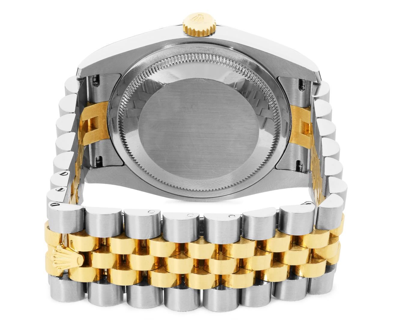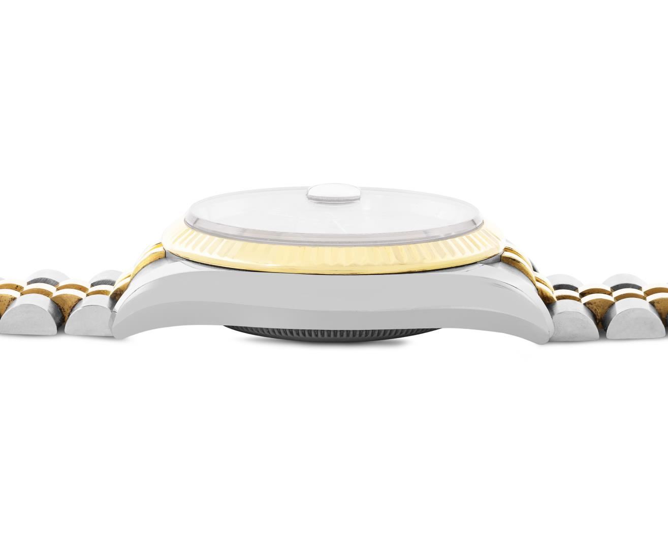 One Mens Pre Owned Sapphire 18K Yellow Gold And Stainless Steel Rolex Datejust 36MM Polished, Serviced And Electronically Tested, Rolex Yellow Gold And Stainless Steel Case: 36mm, Rolex Yellow Gold Crown, Rolex Bezel: 18K Yellow Gold Fluted Bezel. Crystal: Sapphire With Magnified Date Window. Rolex Hands: Solid Hands. Rolex Movement: Automatic Winding Movement 3135. Rolex Dial: Factory Cream Jubilee Arabic Dial. Date Window: 3 O'Clock Position Date Display, Quickset, Model: Quickset Datejust. Condition: G-6 Extra Fine. Rolex Bracelet: Two Tone 18K Yellow Gold And Stainless Steel Jubilee Band. Bright Polish. 7.0 Inch Length, Adjustable. Hidden Clasp, With Rolex Logo. This Watch Has Been Serviced And Polished It Is Free Of All Scratches And Dents. This Watch Comes With Rolex Box.