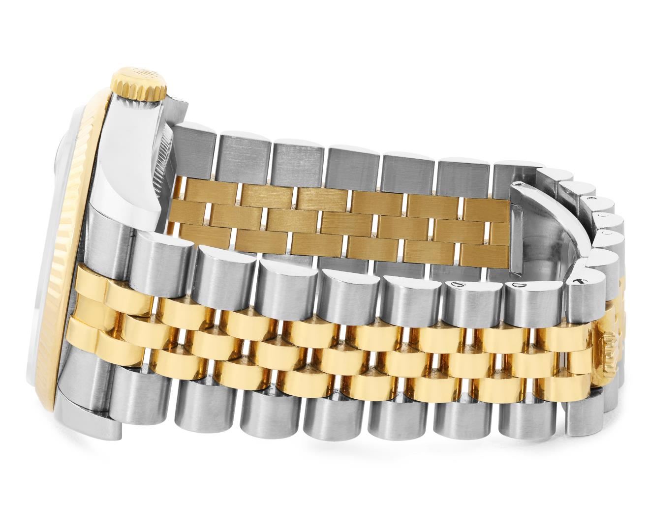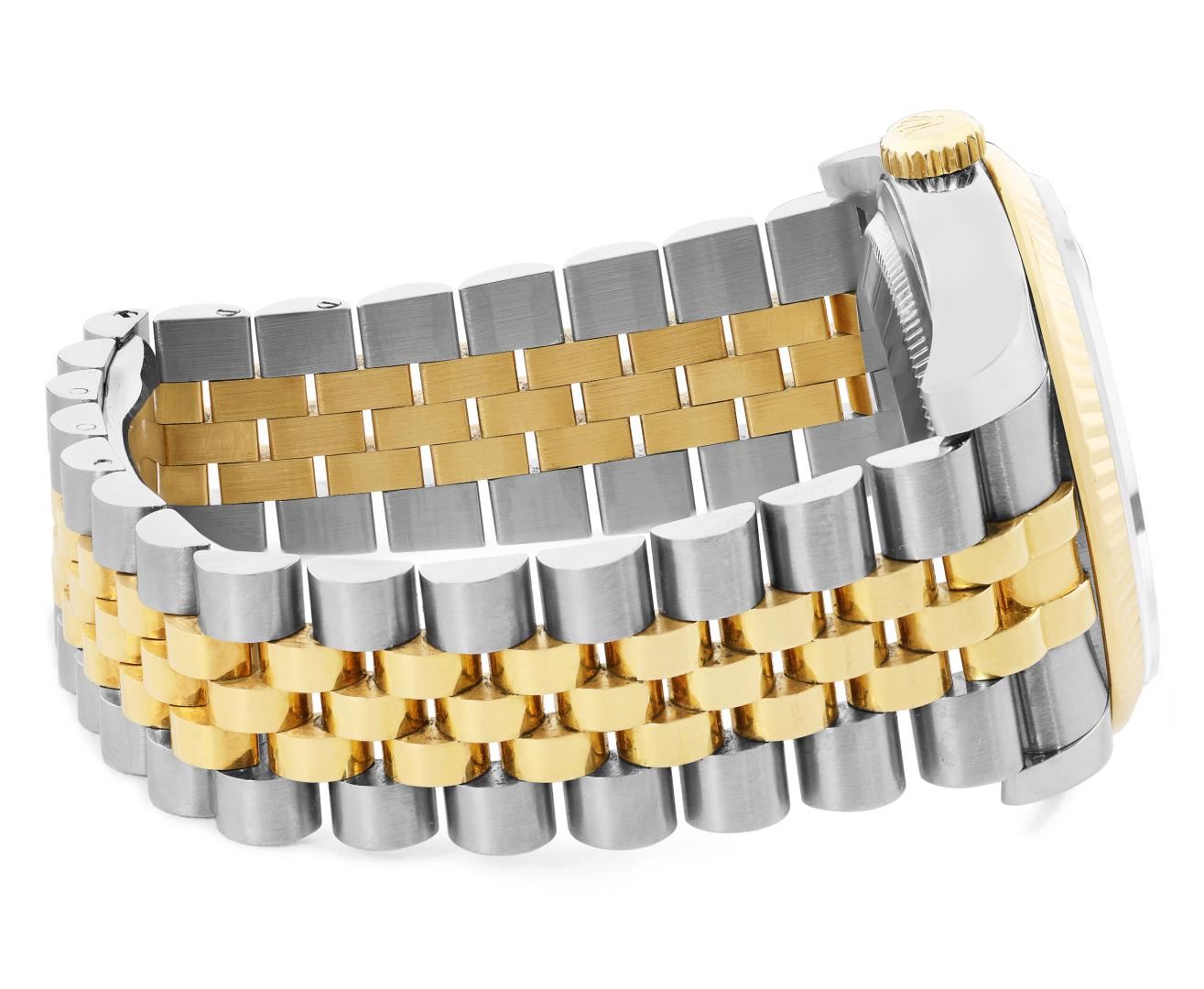 One Mens Pre Owned Sapphire 18K Yellow Gold And Stainless Steel Rolex Datejust 36MM Polished, Serviced And Electronically Tested, Rolex Yellow Gold And Stainless Steel Case: 36mm, Rolex Yellow Gold Crown, Rolex Bezel: 18K Yellow Gold Fluted Bezel. Crystal: Sapphire With Magnified Date Window. Rolex Hands: Solid Hands. Rolex Movement: Automatic Winding Movement 3135. Rolex Dial: Factory Cream Jubilee Arabic Dial. Date Window: 3 O'Clock Position Date Display, Quickset, Model: Quickset Datejust. Condition: G-6 Extra Fine. Rolex Bracelet: Two Tone 18K Yellow Gold And Stainless Steel Jubilee Band. Bright Polish. 7.0 Inch Length, Adjustable. Hidden Clasp, With Rolex Logo. This Watch Has Been Serviced And Polished It Is Free Of All Scratches And Dents. This Watch Comes With Rolex Box.