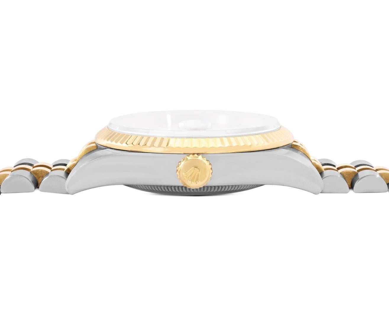 One Mens Pre Owned Sapphire 18K Yellow Gold And Stainless Steel Rolex Datejust 36MM Polished, Serviced And Electronically Tested, Rolex Yellow Gold And Stainless Steel Case: 36mm, Rolex Yellow Gold Crown, Rolex Bezel: 18K Yellow Gold Fluted Bezel. Crystal: Sapphire With Magnified Date Window. Rolex Hands: Solid Hands. Rolex Movement: Automatic Winding Movement 3135. Rolex Dial: Factory White Roman Dial. Date Window: 3 O'Clock Position Date Display, Quickset, Model: Quickset Datejust. Condition: G-6 Extra Fine. Rolex Bracelet: Two Tone 18K Yellow Gold And Stainless Steel Jubilee Band. Bright Polish. 7.0 Inch Length, Adjustable. Hidden Clasp, With Rolex Logo. This Watch Has Been Serviced And Polished It Is Free Of All Scratches And Dents. This Watch Comes With Rolex Box.