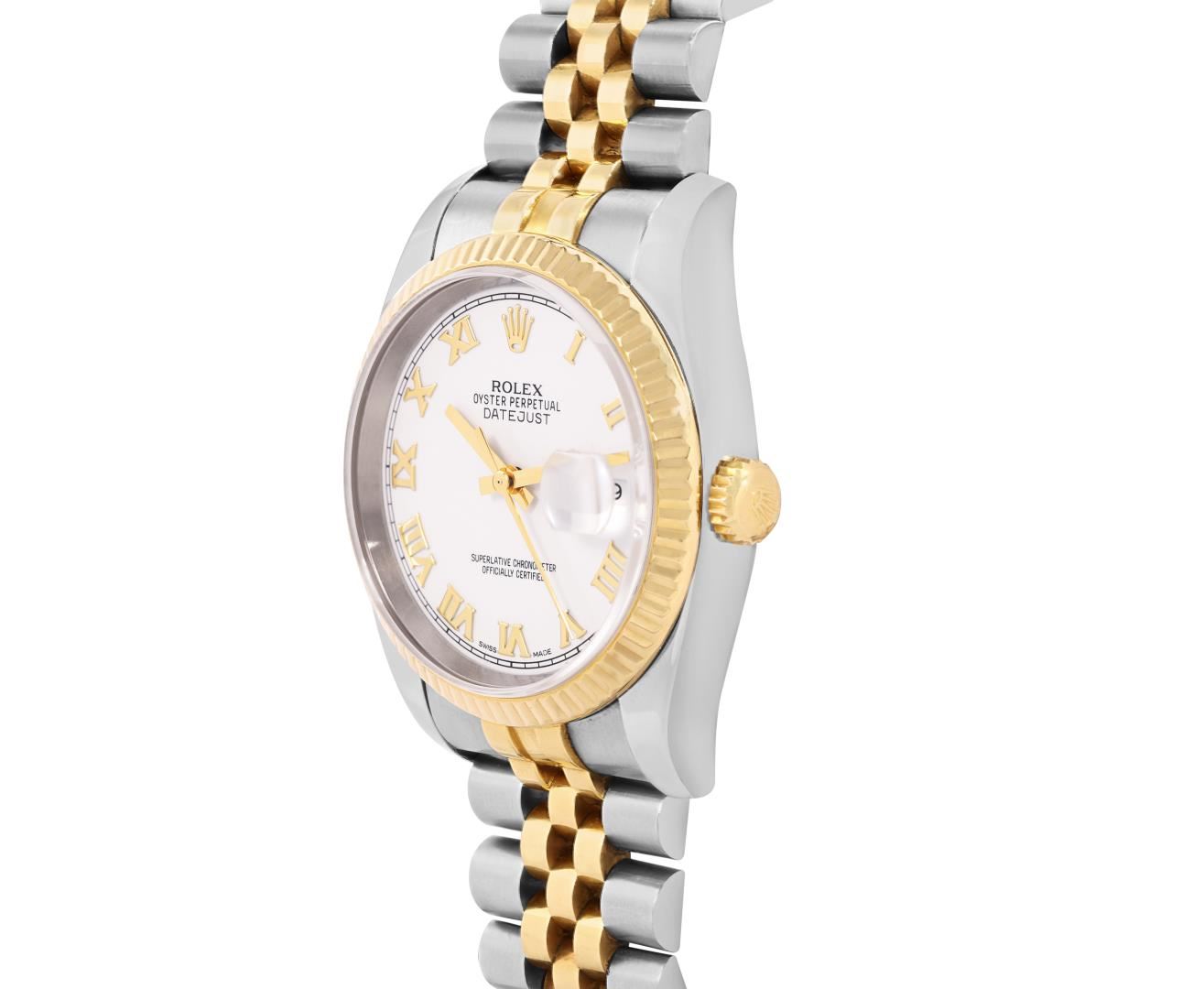 One Mens Pre Owned Sapphire 18K Yellow Gold And Stainless Steel Rolex Datejust 36MM Polished, Serviced And Electronically Tested, Rolex Yellow Gold And Stainless Steel Case: 36mm, Rolex Yellow Gold Crown, Rolex Bezel: 18K Yellow Gold Fluted Bezel. Crystal: Sapphire With Magnified Date Window. Rolex Hands: Solid Hands. Rolex Movement: Automatic Winding Movement 3135. Rolex Dial: Factory White Roman Dial. Date Window: 3 O'Clock Position Date Display, Quickset, Model: Quickset Datejust. Condition: G-6 Extra Fine. Rolex Bracelet: Two Tone 18K Yellow Gold And Stainless Steel Jubilee Band. Bright Polish. 7.0 Inch Length, Adjustable. Hidden Clasp, With Rolex Logo. This Watch Has Been Serviced And Polished It Is Free Of All Scratches And Dents. This Watch Comes With Rolex Box.