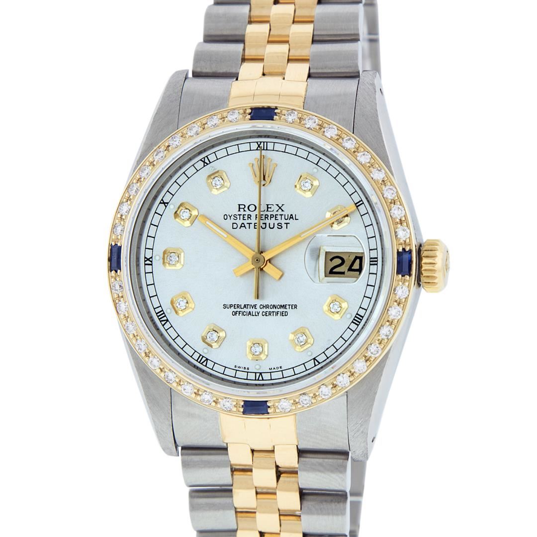 One Mens Pre Owned Two Tone Yellow Gold And Stainless Steel Rolex Datejust Polished, Serviced And Electronically Tested, Rolex Yellow Gold And Stainless Steel Case: 36mm, Yellow Gold Crown, Custom Bezel: New 18K Yellow Gold Sapphire Beadset Diamond Bezel, Diamond Count: 36 Diamonds + 4 Sapphires. Custom Crystal: New Sapphire With Magnified Date. Custom Hands: New Luminescent Hands. Rolex Movement: Automatic Winding Movement 3035. Custom Dial: Custom Silver Dial With Added Diamonds, Diamond Count: 10 Diamonds On Dial. Date Window: 3 O'Clock Position Date Display, Quickset, Model: Datejust. Condition: G-6 Extra Fine. Rolex Bracelet: Two Tone Yellow Gold And Stainless Steel Jubilee Band. Bright Polish. 7.0 Inch Length, Adjustable. Standard Clasp, With Rolex Logo. This Watch Has Been Serviced Time Tested And Is In Excellent Condition It Is Free Of All Scratches And Dents.