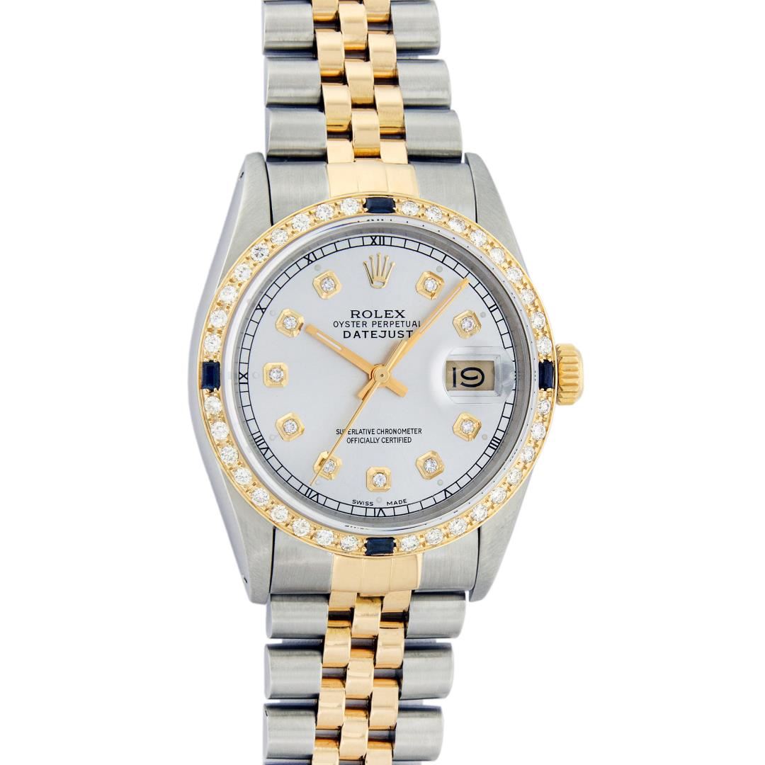 One Mens Pre Owned Two Tone Yellow Gold And Stainless Steel Rolex Datejust Polished, Serviced And Electronically Tested, Rolex Yellow Gold And Stainless Steel Case: 36mm, Yellow Gold Crown, Custom Bezel: New 18K Yellow Gold Sapphire Beadset Diamond Bezel, Diamond Count: 36 Diamonds + 4 Sapphires. Custom Crystal: New Sapphire With Magnified Date. Custom Hands: New Luminescent Hands. Rolex Movement: Automatic Winding Movement 3035. Custom Dial: Custom Silver Dial With Added Diamonds, Diamond Count: 10 Diamonds On Dial. Date Window: 3 O'Clock Position Date Display, Quickset, Model: Datejust. Condition: G-6 Extra Fine. Rolex Bracelet: Two Tone Yellow Gold And Stainless Steel Jubilee Band. Bright Polish. 7.0 Inch Length, Adjustable. Standard Clasp, With Rolex Logo. This Watch Has Been Serviced Time Tested And Is In Excellent Condition It Is Free Of All Scratches And Dents.