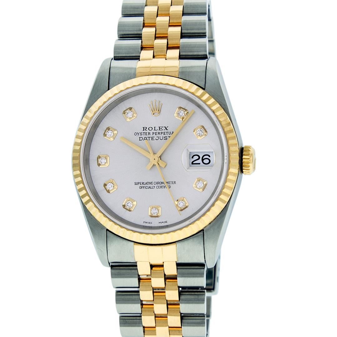 One Mens Pre Owned Yellow Gold And Steel Two Tone Rolex Datejust Polished, Serviced & Electronically Tested, Rolex Yellow Gold & Stainless Steel Case: 36mm, Rolex Yellow Gold Crown, Bezel: Yellow Gold Fluted Bezel. Custom Crystal: New Acrylic With Magnified Date Window. Custom Hands: New Luminescent Hands. Rolex Movement: Automatic Winding Movement 3035. Custom Dial: Custom Silver Dial With Added Diamond Hour Markers, Diamond Count: 10 Diamonds in Dial. Date Window: 3 O'Clock Position Date Display, Quickset, Model: Datejust, Condition: G-6 Extra Fine. Rolex Bracelet: Two Tone Yellow Gold And Stainless Steel Jubilee Band. Bright Polish. 7.0 Inch Length, Adjustable. Standard Clasp, With Rolex Logo. This Watch Has Been Serviced And Polished It Is Free Of All Scratches And Dents.