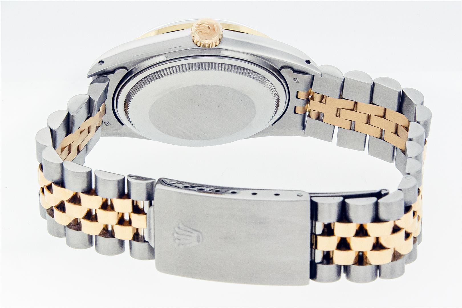 One Mens Pre Owned Two Tone Yellow Gold & Stainless Steel Rolex Datejust Polished, Serviced & Electronically Tested, Yellow Gold & Stainless Steel Case: 36mm, Rolex Yellow Gold Crown, Custom Bezel: New 18K Yellow Gold Emerald Beadset Diamond Bezel, Diamond Count: 36 Diamonds + 4 Emerald, Clarity: SI-VS, Color: G to H. Custom Crystal: New Sapphire With Magnified Date Window. Custom Hands: New Hands. Rolex Movement: Automatic Winding Movement. Rolex Factory Dial: Silver Index With Dash Track & Lumi Dots. Date Window: 3 O'Clock Position Date Display, Quickset, Model: Datejust. Condition: G-6 Extra Fine. Rolex Bracelet: Two Tone Yellow Gold & Stainless Steel Jubilee Band. Bright Polish. 7.0 Inch Length, Adjustable. Standard Clasp, With Rolex Logo. This Watch Has Been Serviced Time Tested And Is In Excellent Condition It Is Free Of All Scratches And Dents.