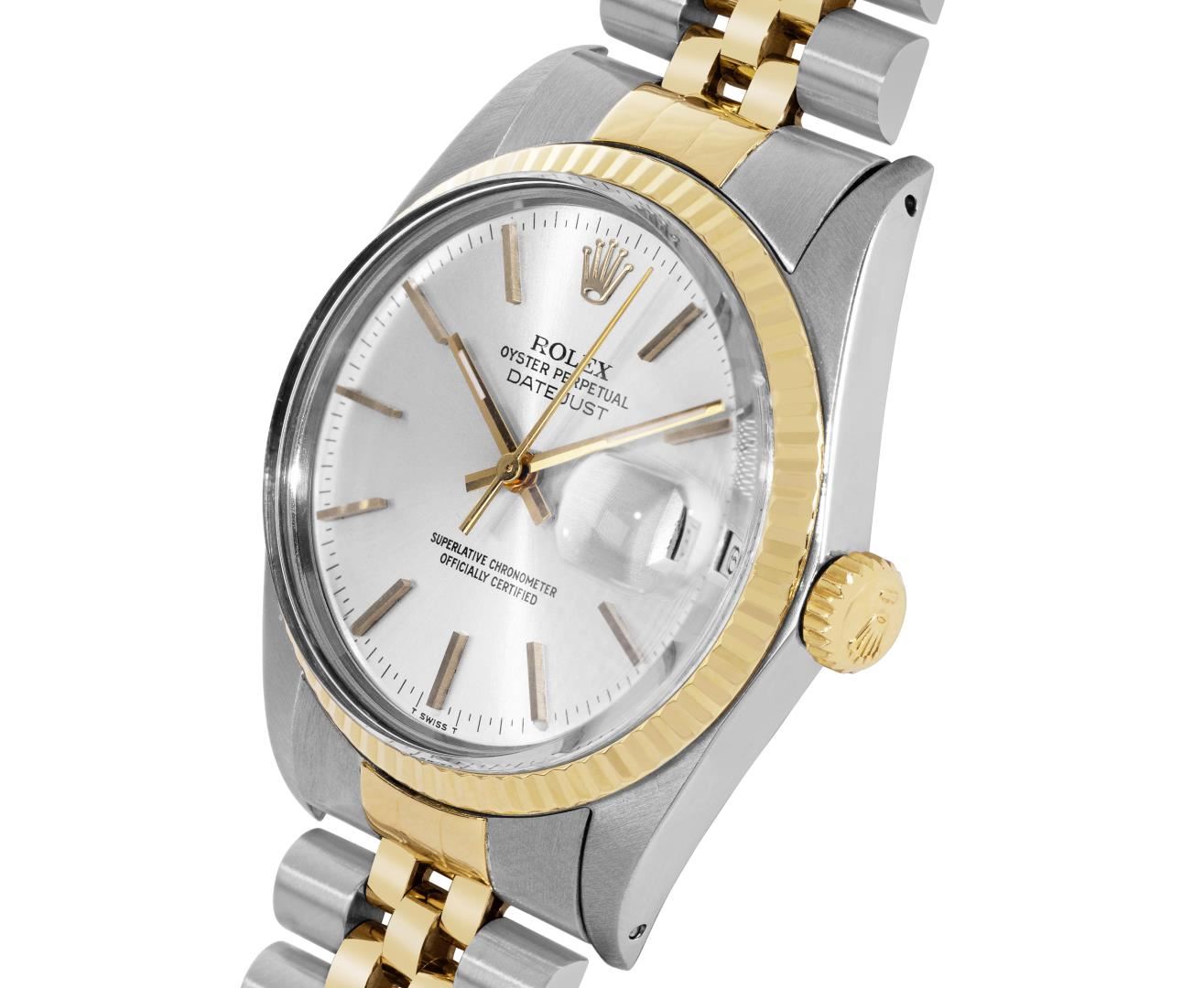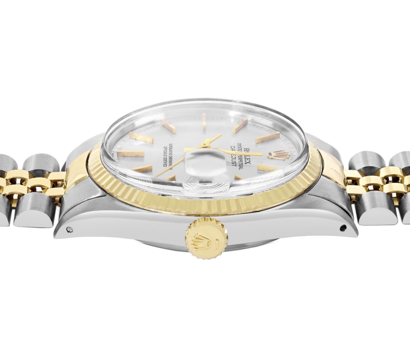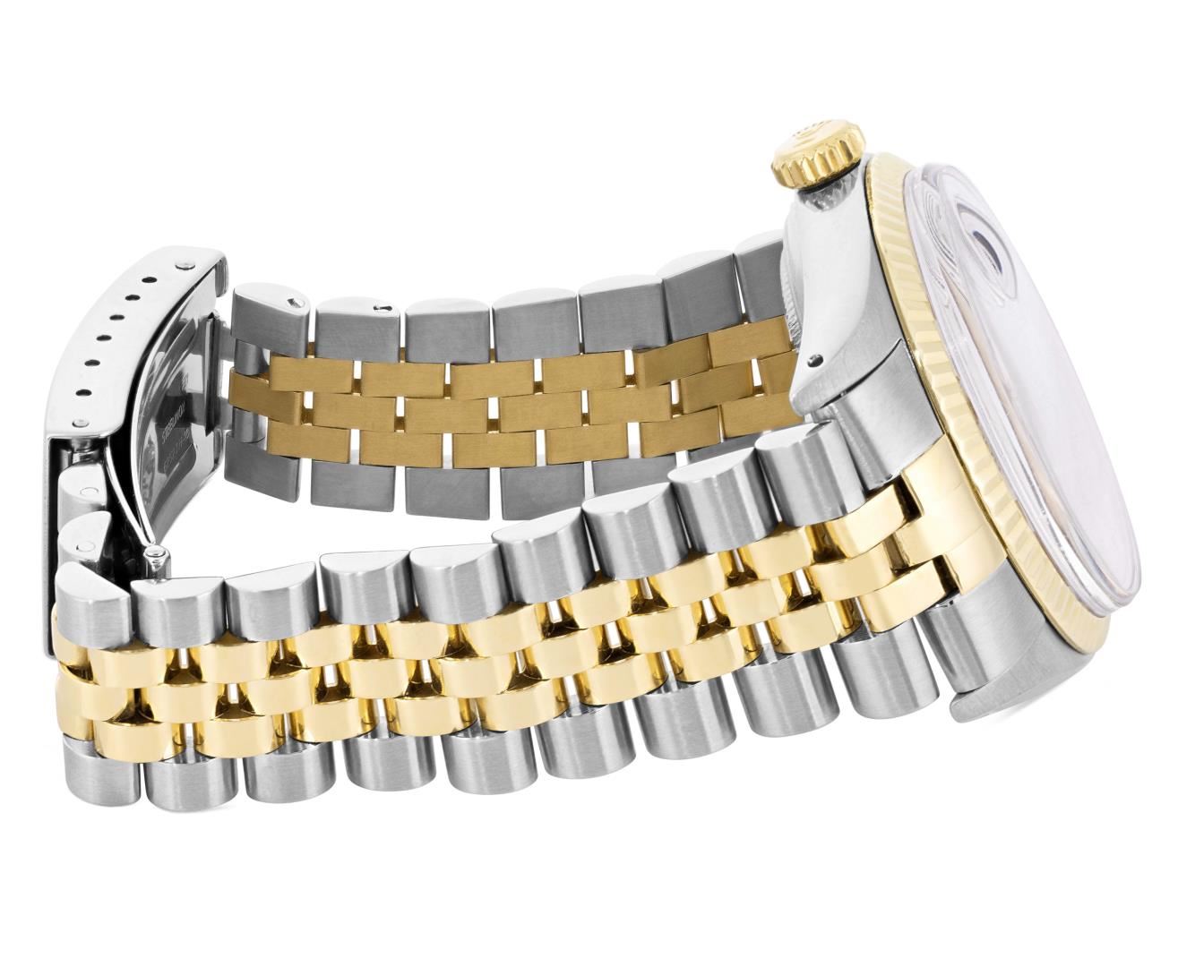 One Mens Pre Owned Yellow Gold Two Tone Rolex Datejust Polished, Serviced And Electronically Tested, Rolex Yellow Gold And Stainless Steel Case: 36mm, Rolex Yellow Gold Crown, Rolex Bezel: Yellow Gold Fluted Bezel. Custom Crystal: New Acrylic With Magnified Date Window. Hands: Luminescent Hands. Rolex Movement: Automatic Winding Movement 3035. Rolex Dial: Silver Dial With Index Hour Markers and Dash Track With Lumi Dots. Date Window: 3 O'Clock Position Date Display, Quickset, Model: Quickset Datejust. Condition: G-6 Extra Fine. Rolex Bracelet: Two Tone Yellow Gold And Stainless Steel Jubilee Band. Bright Polish. 7.0 Inch Length, Adjustable. Standard Clasp, With Rolex Logo. This Watch Has Been Serviced Time Tested And Is In Excellent Condition It Is Free Of All Scratches And Dents.
