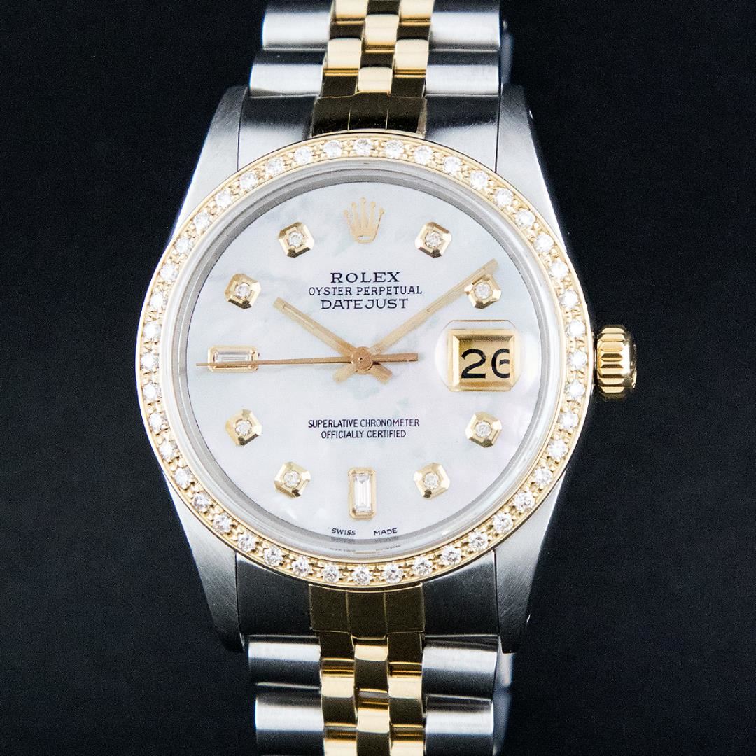 One Mens Pre Owned Yellow Gold And Stainless Steel Two Tone Rolex Datejust Polished, Serviced And Electronically Tested, Rolex Yellow Gold And Stainless Steel Case: 36mm, Yellow Gold Crown, Custom Bezel: New 18K Yellow Gold Beadset Diamond Bezel, Diamond Count: 44 Diamonds. Custom Crystal: New Sapphire With Magnified Date. Rolex Movement: Automatic Winding Movement 3035. Custom Dial: Custom White Dial With Added Diamond Hour Markers, Diamond Count: 8 Diamonds + 2 Baguette Diamond Hour Markers. Date Window: 3 O'Clock Position Date Display, Quickset, Model: Quickset Datejust. Condition: G-6 Extra Fine. Rolex Bracelet: Two Tone Yellow Gold And Stainless Steel Jubilee Band. Bright Polish. 7.0 Inch Length, Adjustable. Standard Clasp, With Rolex Logo. This Watch Has Been Serviced Time Tested And Is In Excellent Condition It Is Free Of All Scratches And Dents.
