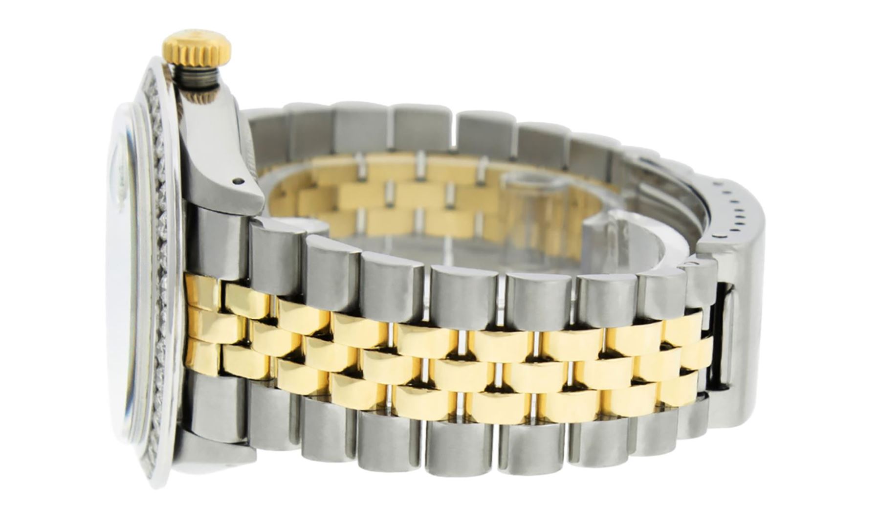 One Mens Pre Owned Yellow Gold and Stainless Steel Rolex Datejust Polished Bright with Satin Finish, Serviced And Electronically Tested, Rolex Stainless Steel Case: 36mm, Rolex Yellow Gold Crown, Custom Bezel: New 18K White Gold 3ct Channel Set Diamond Bezel, Diamond Count: 40 Diamonds, Total Weight 3.00 Carat. Custom Crystal: New Sapphire With Magnified Date Window. Custom Hands: New Luminecent Hands. Rolex Movement: Automatic Winding Movement 3035. Custom Dial: Custom White Roman Dial With Square Track. Date Window: 3 O'Clock Position Date Display, Quickset, Model: Datejust Condition: G-6 Extra Fine. Rolex Bracelet: Yellow Gold And Stainless Steel Jubilee Band. Bright Polish & Satin Finish. 7.0 Inch Length, Adjustable. Standard Clasp, With Rolex Logo. This Watch Has Been Serviced And Polished It Is Free Of All Scratches And Dents.