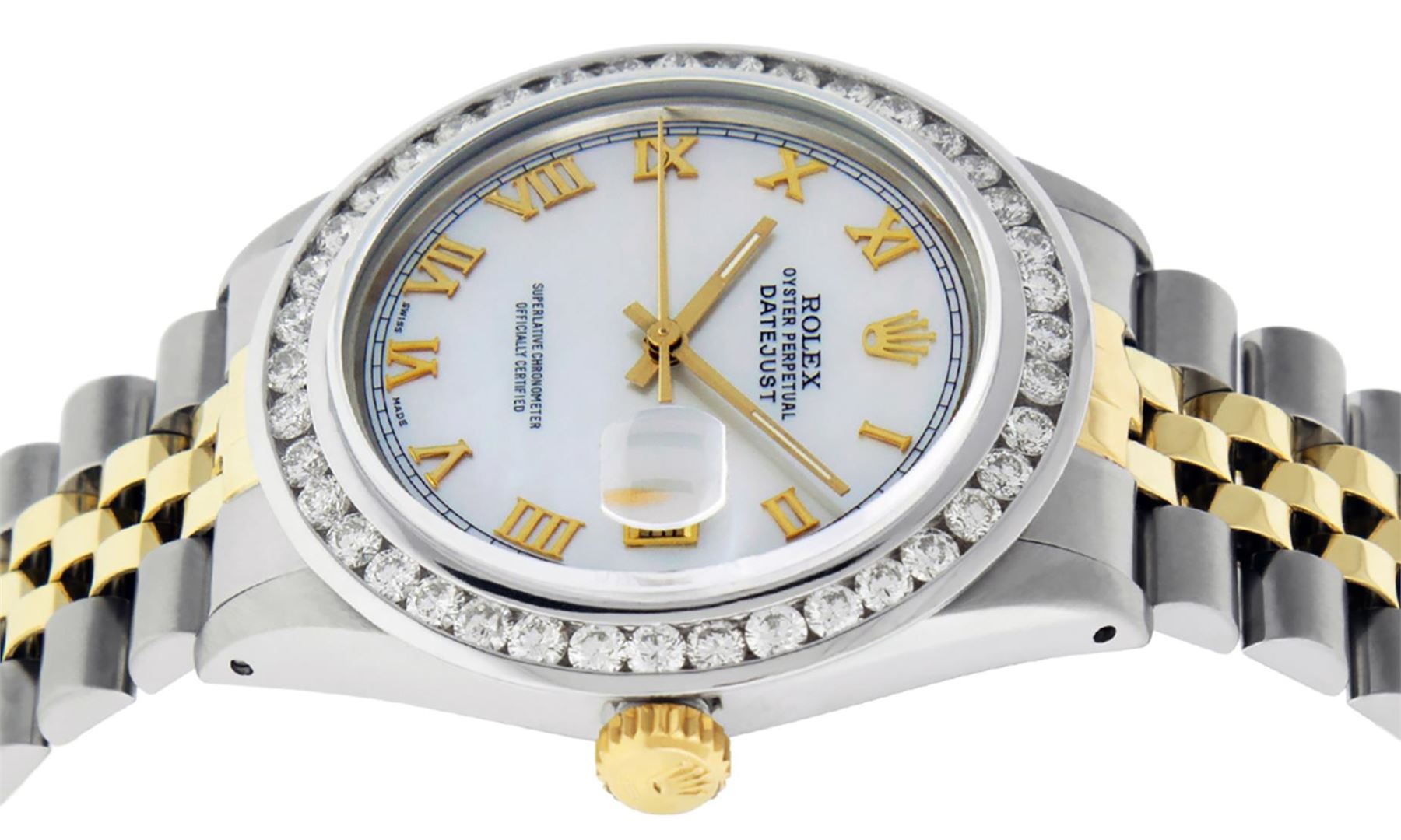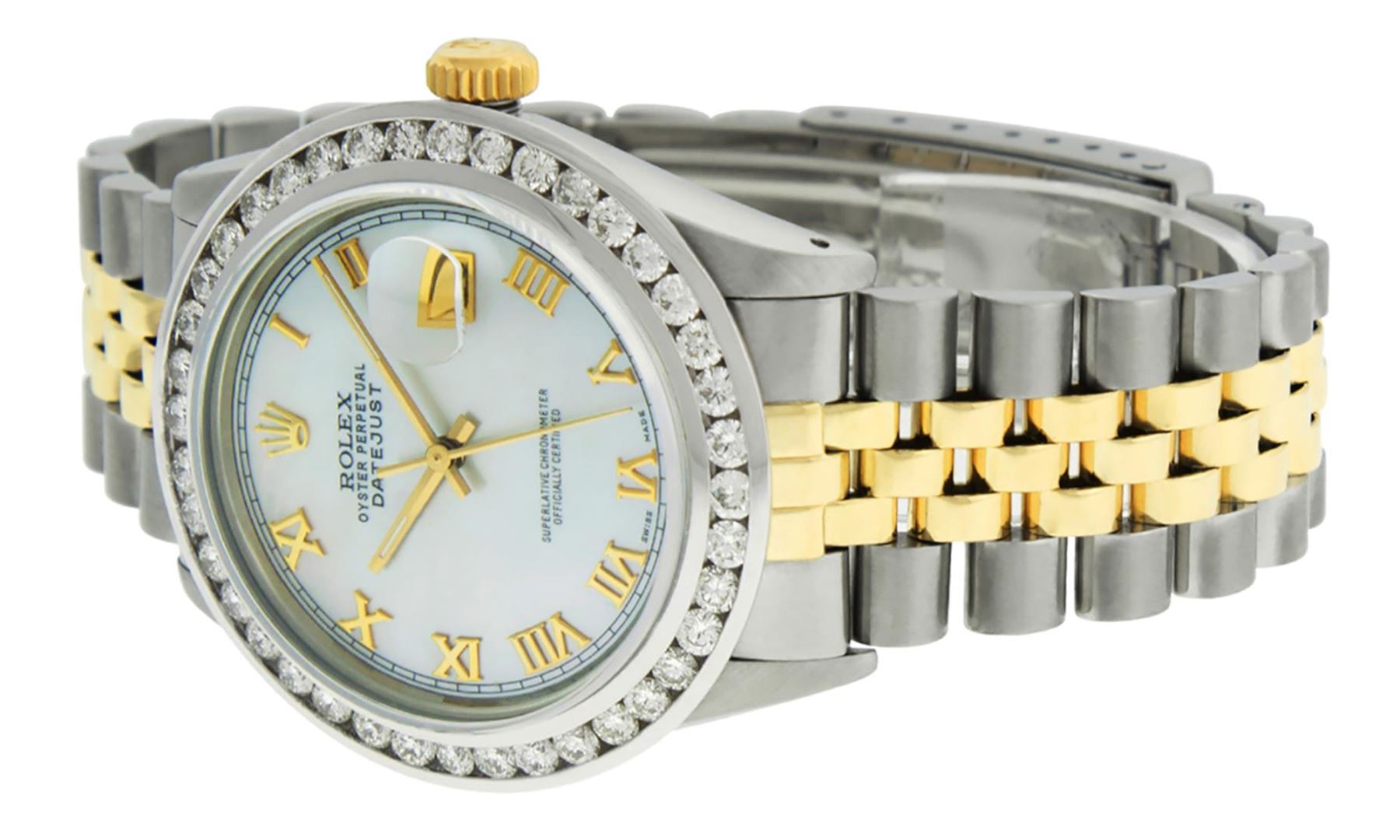 One Mens Pre Owned Yellow Gold and Stainless Steel Rolex Datejust Polished Bright with Satin Finish, Serviced And Electronically Tested, Rolex Stainless Steel Case: 36mm, Rolex Yellow Gold Crown, Custom Bezel: New 18K White Gold 3ct Channel Set Diamond Bezel, Diamond Count: 40 Diamonds, Total Weight 3.00 Carat. Custom Crystal: New Sapphire With Magnified Date Window. Custom Hands: New Luminecent Hands. Rolex Movement: Automatic Winding Movement 3035. Custom Dial: Custom White Roman Dial With Square Track. Date Window: 3 O'Clock Position Date Display, Quickset, Model: Datejust Condition: G-6 Extra Fine. Rolex Bracelet: Yellow Gold And Stainless Steel Jubilee Band. Bright Polish & Satin Finish. 7.0 Inch Length, Adjustable. Standard Clasp, With Rolex Logo. This Watch Has Been Serviced And Polished It Is Free Of All Scratches And Dents.
