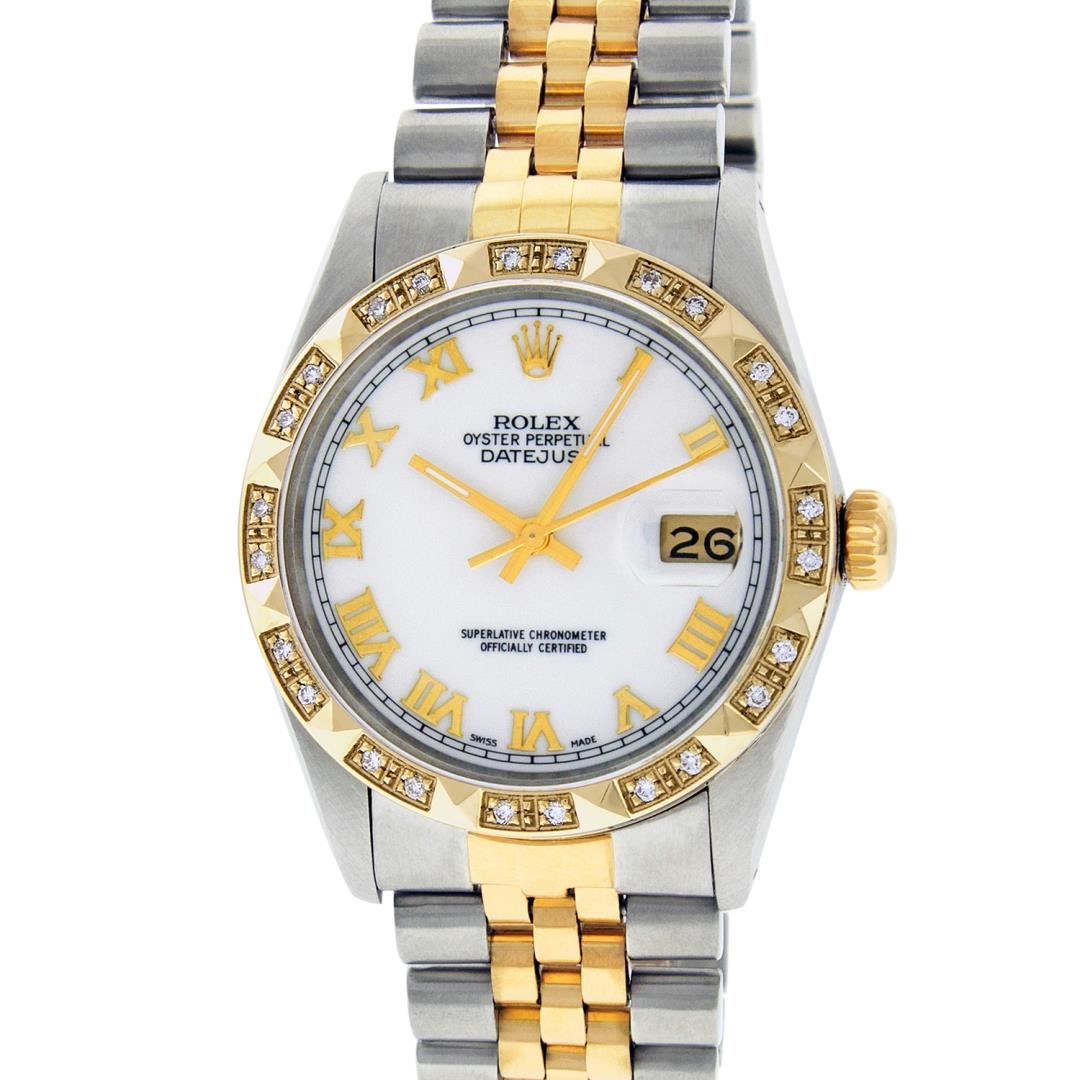 One Mens Pre Owned Two Tone Yellow Gold And Stainless Steel Rolex Datejust Polished Bright with Satin Finish, Serviced And Electronically Tested, Rolex Stainless Steel Case: 36mm, Rolex Yellow Gold Crown, Custom Bezel: New 18K Yellow Gold Pyramid Diamond Bezel, Diamond Count: 24 Diamonds. Custom Crystal: New Sapphire With Magnified Date. Custom Hands: New Luminescent Hands. Rolex Movement: Automatic Winding Movement 3035. Custom Dial: Custom White Roman With Square Track. Date Window: 3 O'Clock Position Date Display, Quickset, Model: Datejust. Condition: G-6 Extra Fine. Rolex Bracelet: Yellow Gold And Stainless Steel Jubilee Band. Bright Polish And Satin Finish. 7.0 Inch Length, Adjustable. Standard Clasp, With Rolex Logo. This Watch Has Been Serviced And Polished It Is Free Of All Scratches And Dents.