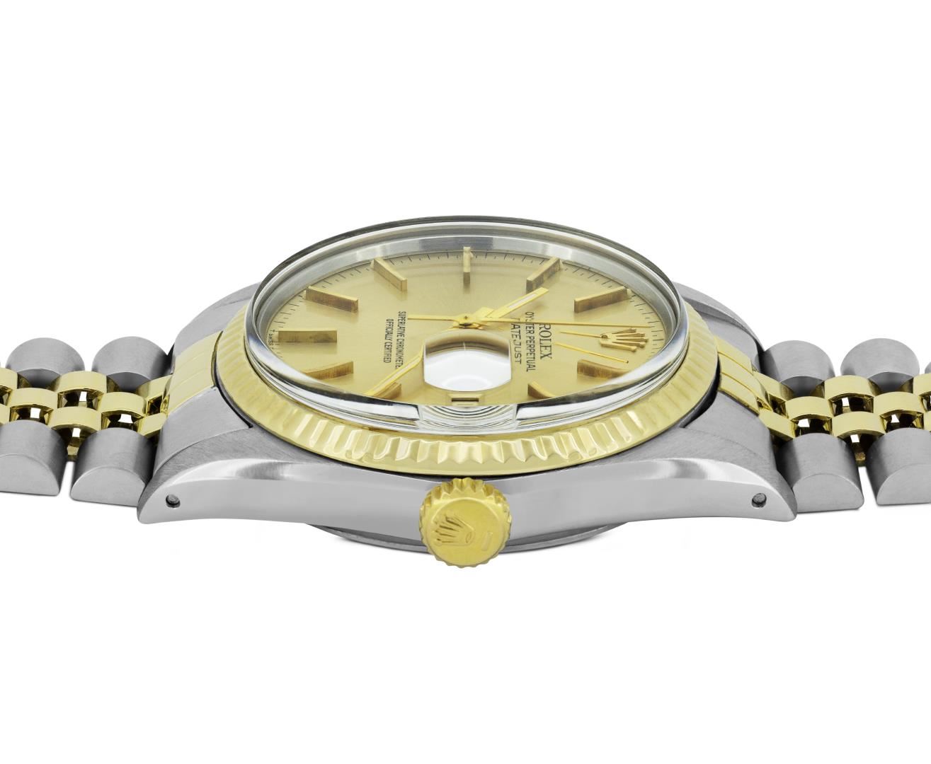 One Mens Pre Owned Yellow Gold Two Tone Rolex Datejust Polished, Serviced & Electronically Tested, Rolex Yellow Gold And Stainless Steel Case: 36mm, Rolex Yellow Gold Crown, Rolex Bezel: Yellow Gold Fluted Bezel. Custom Crystal: New Acrylic With Magnified Date Window. Custom Hands: New Luminecent Hands. Rolex Movement: Automatic Winding Movement 3035. Rolex Dial: Champagne Dial With Index Hour Markers and Dash Track With Lumi Dots. Date Window: 3 O'Clock Position Date Display, Quickset, Model: Quickset Datejust. Condition: G-6 Extra Fine. Rolex Bracelet: Two Tone Yellow Gold And Stainless Steel Jubilee Band. Bright Polish. 7.0 Inch Length, Adjustable. Standard Clasp, With Rolex Logo. This Watch Has Been Serviced Time Tested And Is In Excellent Condition It Is Free Of All Scratches And Dents.