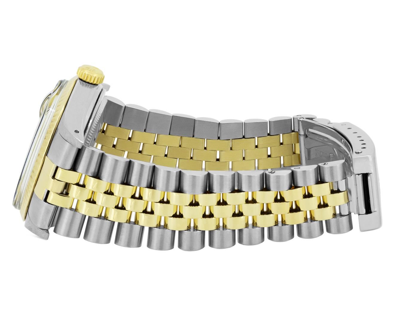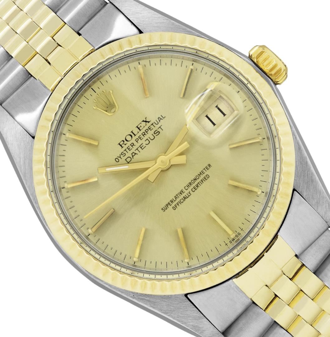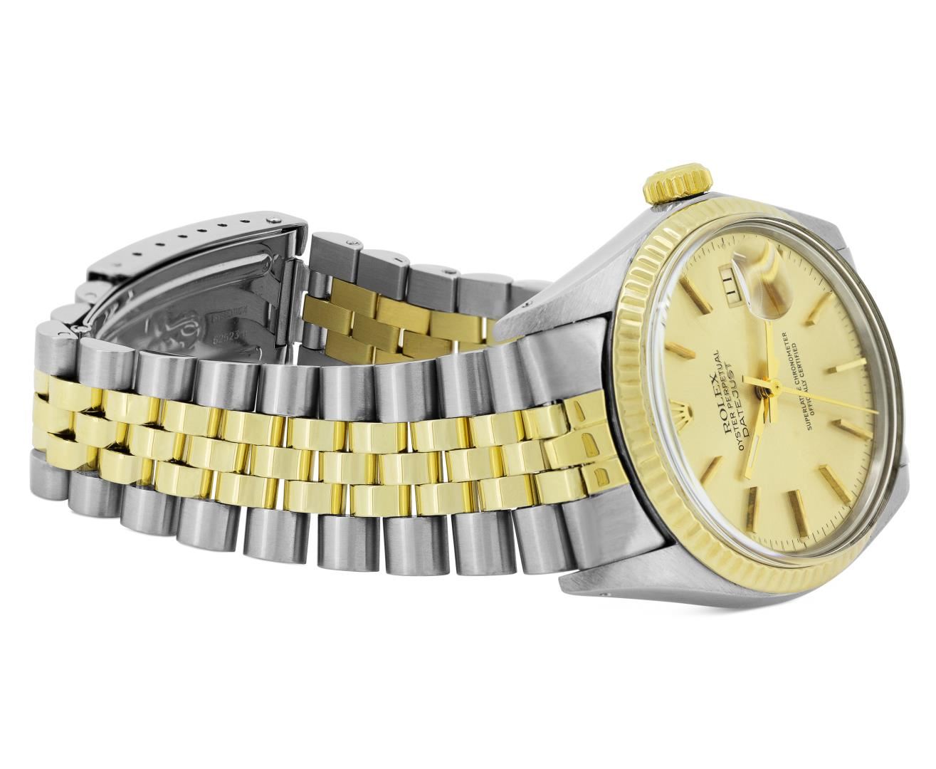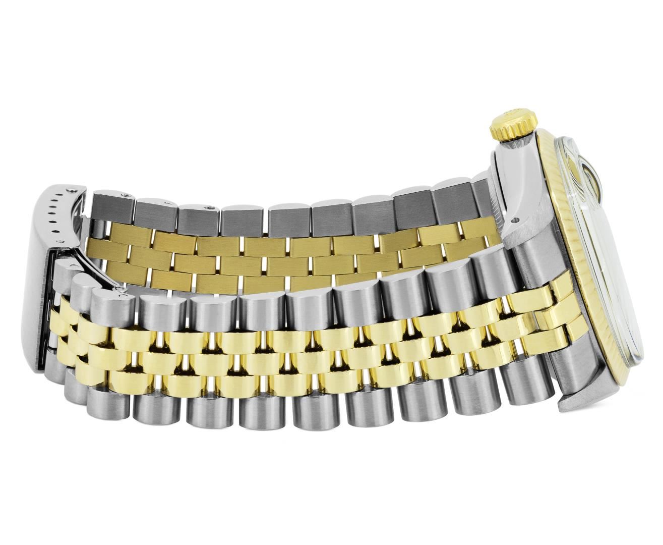 One Mens Pre Owned Yellow Gold Two Tone Rolex Datejust Polished, Serviced & Electronically Tested, Rolex Yellow Gold And Stainless Steel Case: 36mm, Rolex Yellow Gold Crown, Rolex Bezel: Yellow Gold Fluted Bezel. Custom Crystal: New Acrylic With Magnified Date Window. Custom Hands: New Luminecent Hands. Rolex Movement: Automatic Winding Movement 3035. Rolex Dial: Champagne Dial With Index Hour Markers and Dash Track With Lumi Dots. Date Window: 3 O'Clock Position Date Display, Quickset, Model: Quickset Datejust. Condition: G-6 Extra Fine. Rolex Bracelet: Two Tone Yellow Gold And Stainless Steel Jubilee Band. Bright Polish. 7.0 Inch Length, Adjustable. Standard Clasp, With Rolex Logo. This Watch Has Been Serviced Time Tested And Is In Excellent Condition It Is Free Of All Scratches And Dents.