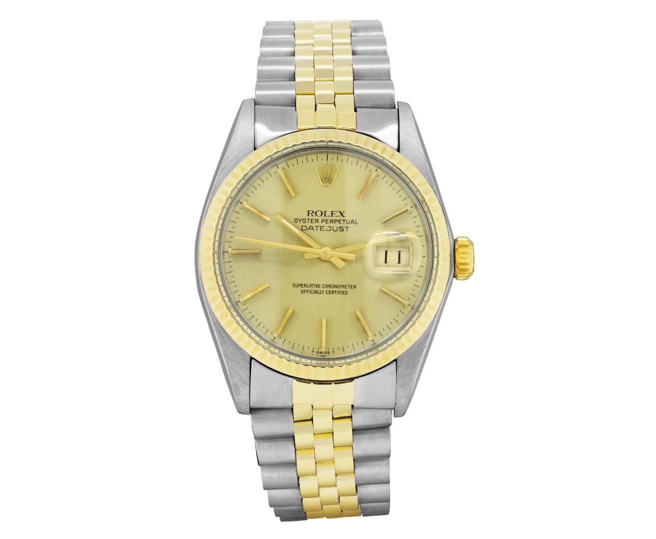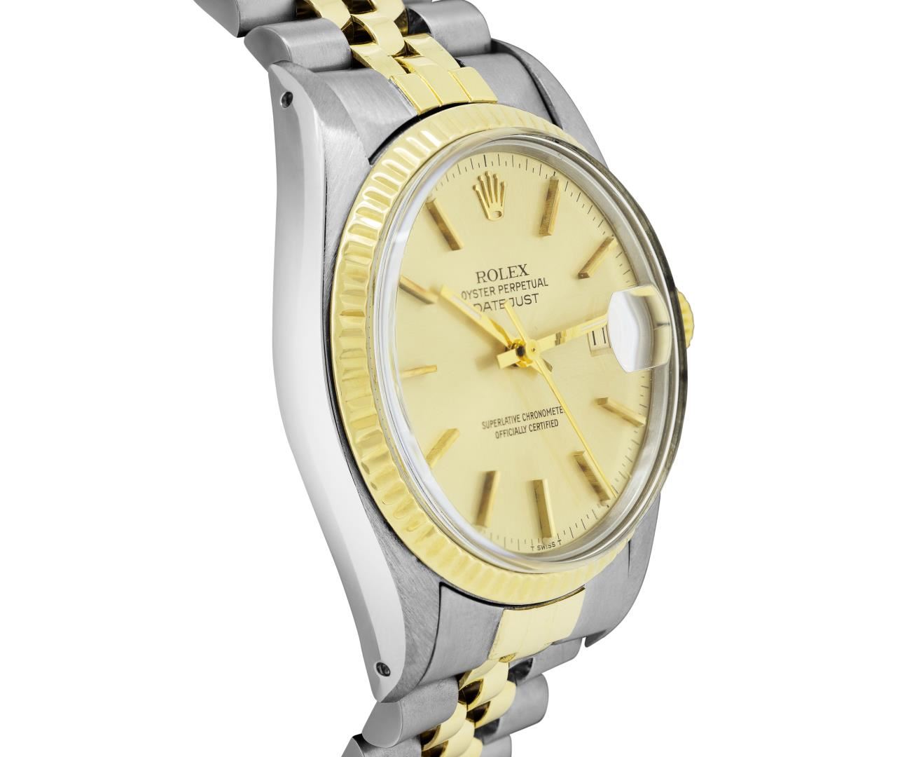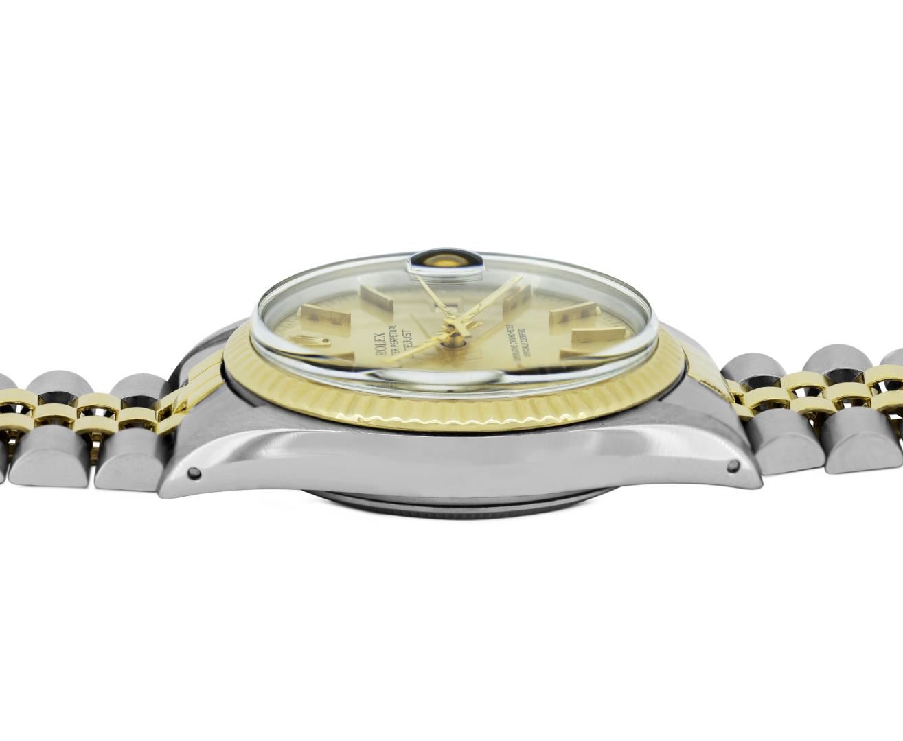 One Mens Pre Owned Yellow Gold Two Tone Rolex Datejust Polished, Serviced & Electronically Tested, Rolex Yellow Gold And Stainless Steel Case: 36mm, Rolex Yellow Gold Crown, Rolex Bezel: Yellow Gold Fluted Bezel. Custom Crystal: New Acrylic With Magnified Date Window. Custom Hands: New Luminecent Hands. Rolex Movement: Automatic Winding Movement 3035. Rolex Dial: Champagne Dial With Index Hour Markers and Dash Track With Lumi Dots. Date Window: 3 O'Clock Position Date Display, Quickset, Model: Quickset Datejust. Condition: G-6 Extra Fine. Rolex Bracelet: Two Tone Yellow Gold And Stainless Steel Jubilee Band. Bright Polish. 7.0 Inch Length, Adjustable. Standard Clasp, With Rolex Logo. This Watch Has Been Serviced Time Tested And Is In Excellent Condition It Is Free Of All Scratches And Dents.