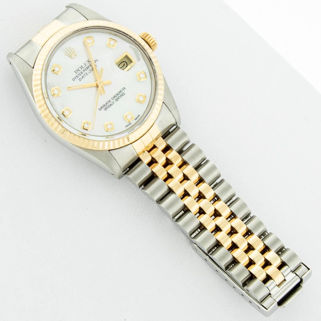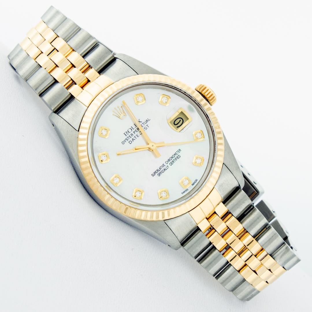 One Mens Pre Owned Two Tone Yellow Gold And Stainless Steel Rolex Datejust Polished, Serviced And Electronically Tested, Rolex Yellow Gold And Stainless Steel Case: 36mm, Rolex Yellow Gold Crown, Rolex Bezel: Yellow Gold Fluted Bezel. Custom Crystal: New Acrylic With Magnified Date Window. Custom Hands: New Hands. Rolex Movement: Automatic Winding Movement 3035. Custom Dial: Custom White Dial With Added Genuine Diamond Hour Markers, Diamond Count: 10 Diamonds On Dial. Date Window: 3 O'Clock Position Date Display, Quickset, Model: Datejust. Condition: G-6 Extra Fine. Rolex Bracelet: Two Tone Yellow Gold And Stainless Steel Jubilee Band. Bright Polish. 7.0 Inch Length, Adjustable. Standard Clasp, With Rolex Logo. Watch Has Been Serviced And Polished It Is Free Of All Scratches And Dents.