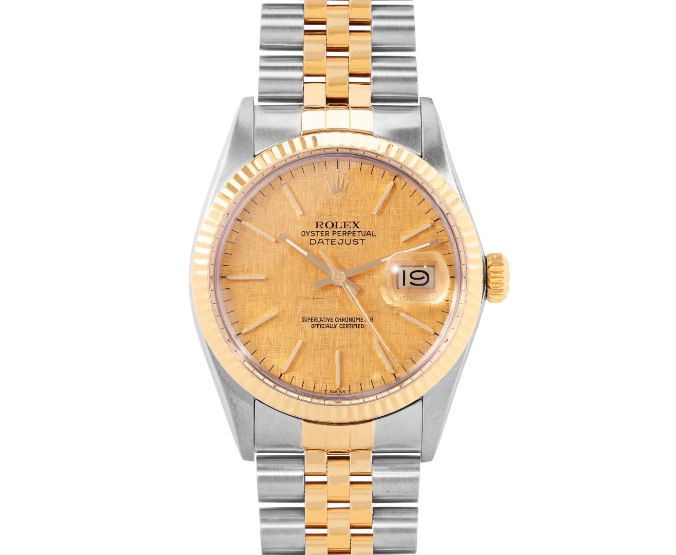 One Mens Pre Owned 18K Two Tone Yellow Gold And Stainless Steel Rolex Datejust Polished, Serviced And Electronically Tested, Rolex Yellow Gold And Stainless Steel Case: 36mm, Rolex Yellow Gold Crown, Rolex Bezel: Yellow Gold Fluted Bezel. Custom Crystal: New Plastic With Magnified Date Window. Hands: Luminescent Hands. Rolex Movement: Automatic Winding Movement 3035. Rolex Dial: Tapestry Champagne Dial With Index Hour Markers and Dash Track With Lumi Dots. Date Window: 3 O'Clock Position Date Display, Quickset, Model: Quickset Datejust. Condition: G-6 Extra Fine. Rolex Bracelet: Two Tone Yellow Gold And Stainless Steel Jubilee Band. Bright Polish. 7.0 Inch Length, Adjustable. Standard Clasp, With Rolex Logo. This Watch Has Been Serviced Time Tested And Is In Excellent Condition It Is Free Of All Scratches And Dents. This Watch Comes With A Rolex Box.