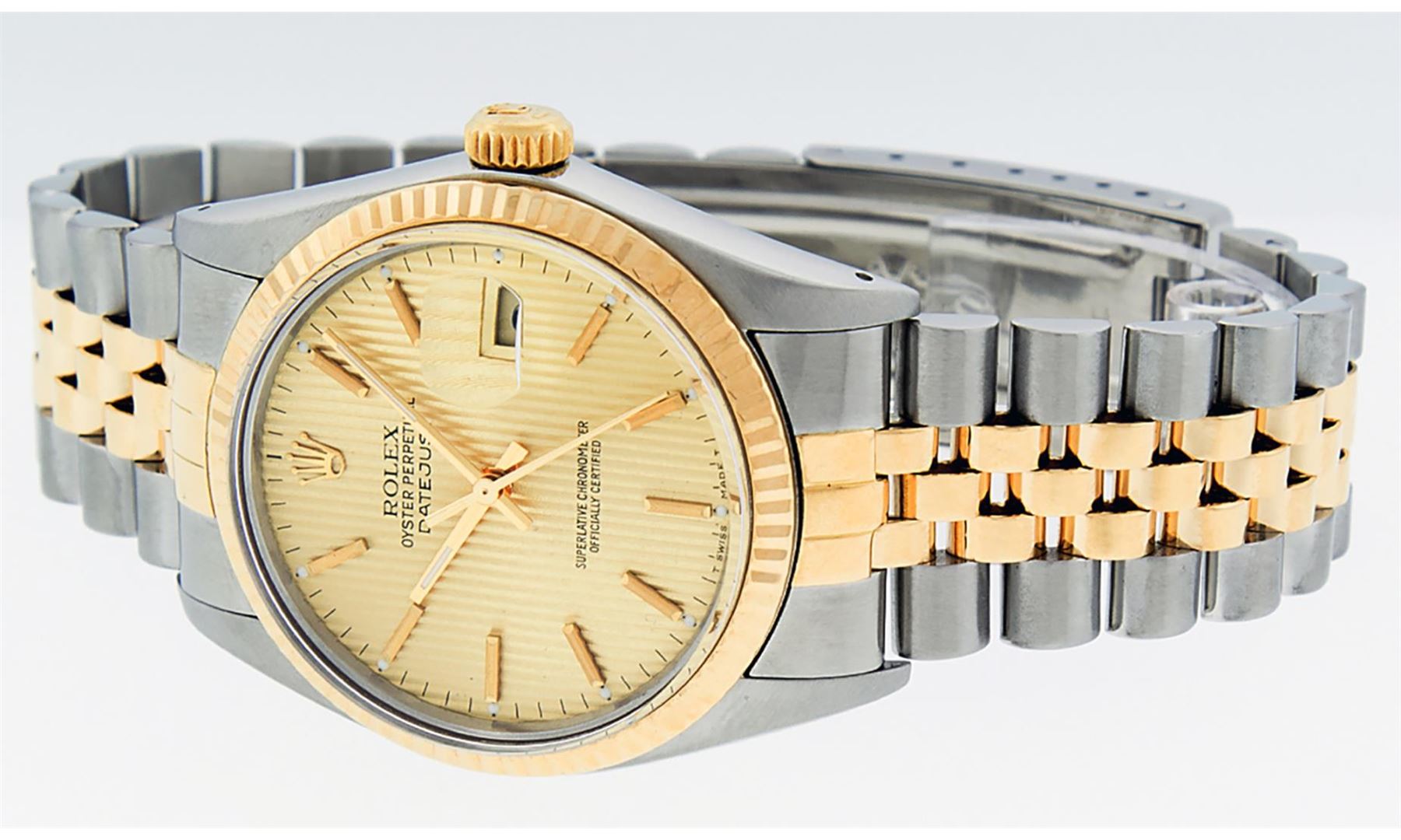 One Rolex Pre Owned Mens Two Tone Yellow Gold And Stainless Steel Rolex Datejust Polished, Serviced And Electronically Tested, Yellow Gold And Stainless Steel Case: 36mm, Yellow Gold Crown, Rolex Bezel: Yellow Gold Fluted Bezel. Custom Crystal: New Acrylic With Magnified Date Window. Custom Hands: New Luminescent Hands. Rolex Movement: Automatic Winding Movement 3035. Rolex Dial: Champagne Tapestry Dial With Index Hour Markers Dash Track & Lumi Dots. Date Window: 3 O'Clock Position Date Display, Quickset, Model: Datejust, Condition: G-6 Extra Fine. Rolex Bracelet: Two Tone Yellow Gold And Stainless Steel Jubilee Band. Bright Polish. 7.0 Inch Length, Adjustable. Standard Clasp, With Rolex Logo. This Watch Has Been Serviced Time Tested And Is In Excellent Condition It Is Free Of All Scratches And Dents.