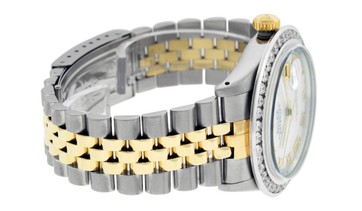 One Mens Rolex Datejust Polished Bright with Satin Finish, Serviced & Electronically Tested, Stainless Steel Case:36mm, Yellow Gold Crown, Custom Bezel: 18K White Gold 3ct Channel Set Diamond Bezel, Diamond Count: 40 Diamonds, Total Weight 3.00 Carat, Clarity: SI-VS, Color: G to H. Custom Crystal: Synthetic Sapphire Cyclops Lens. Movement: Automatic Winding Movement Caliber 3035. Custom Dial: White Roman Dial With Square Track. Date Window: 3 O'Clock Position Date Display, Quickset, Model: Datejust Condition: G-6 Extra Fine. Bracelet: 14K Yellow Gold And Stainless Steel Jubilee Band. Bright Polish & Satin Finish. 7.0 Inch Length, Adjustable. Standard Clasp, With Rolex Logo. This watch has been serviced and polished and its free of all dents and scratches and has been time tested.
